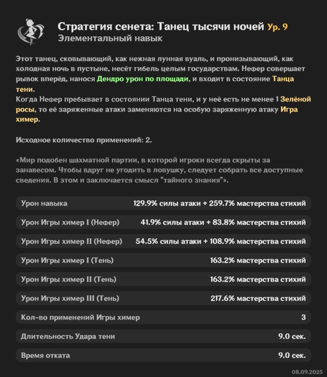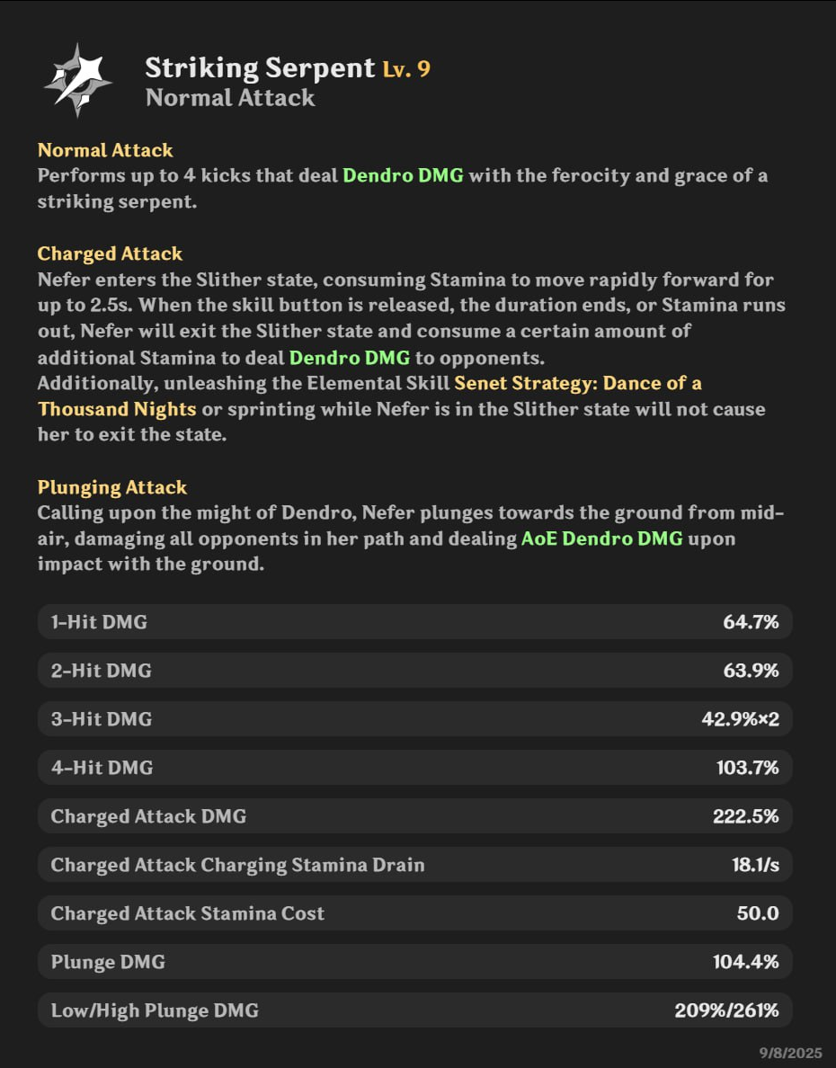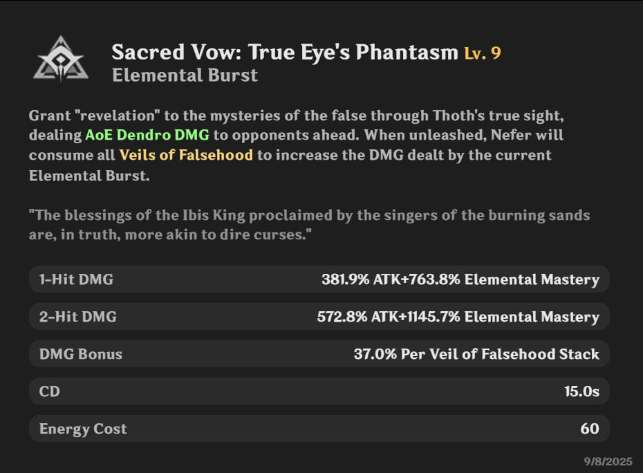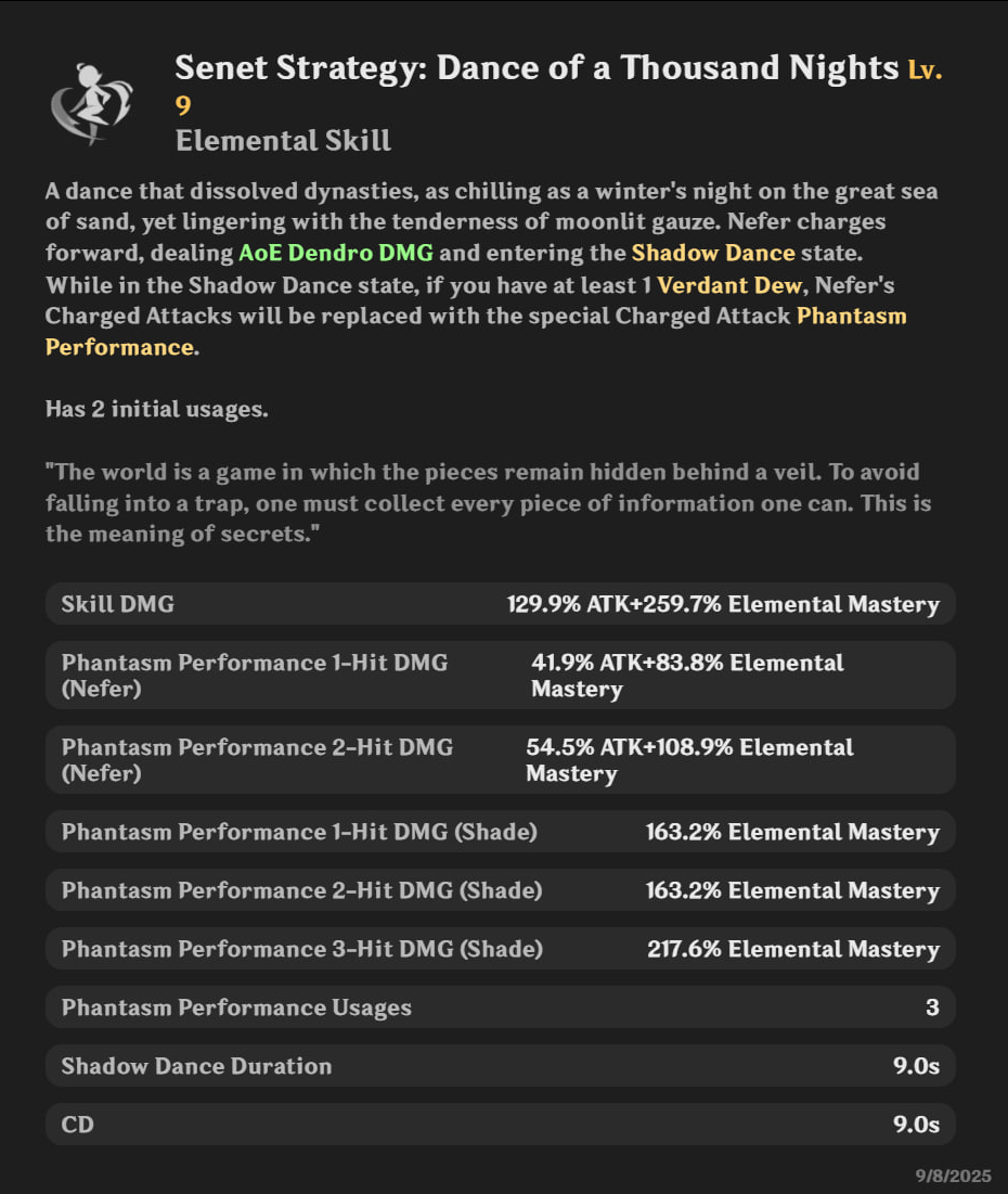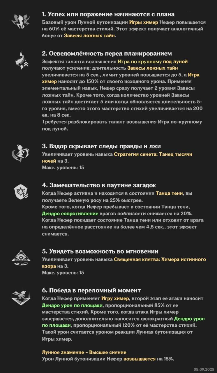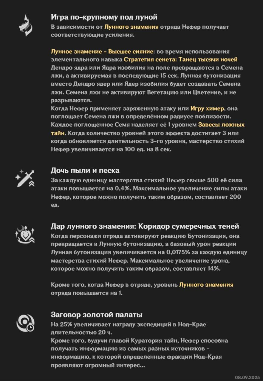 Нефер — Dendro персонаж через МС. Главный урон идёт от Lunar-Bloom и особых Charged атак (Phantasm Performance). Стаки дают бонус к МС, с созвездиями — больше урона и -20% Dendro RES у врагов.