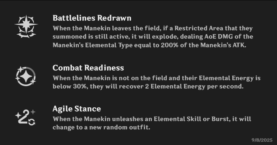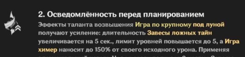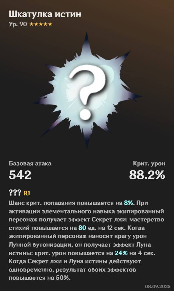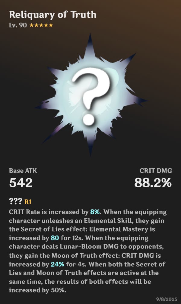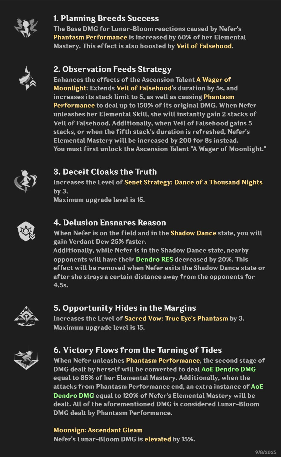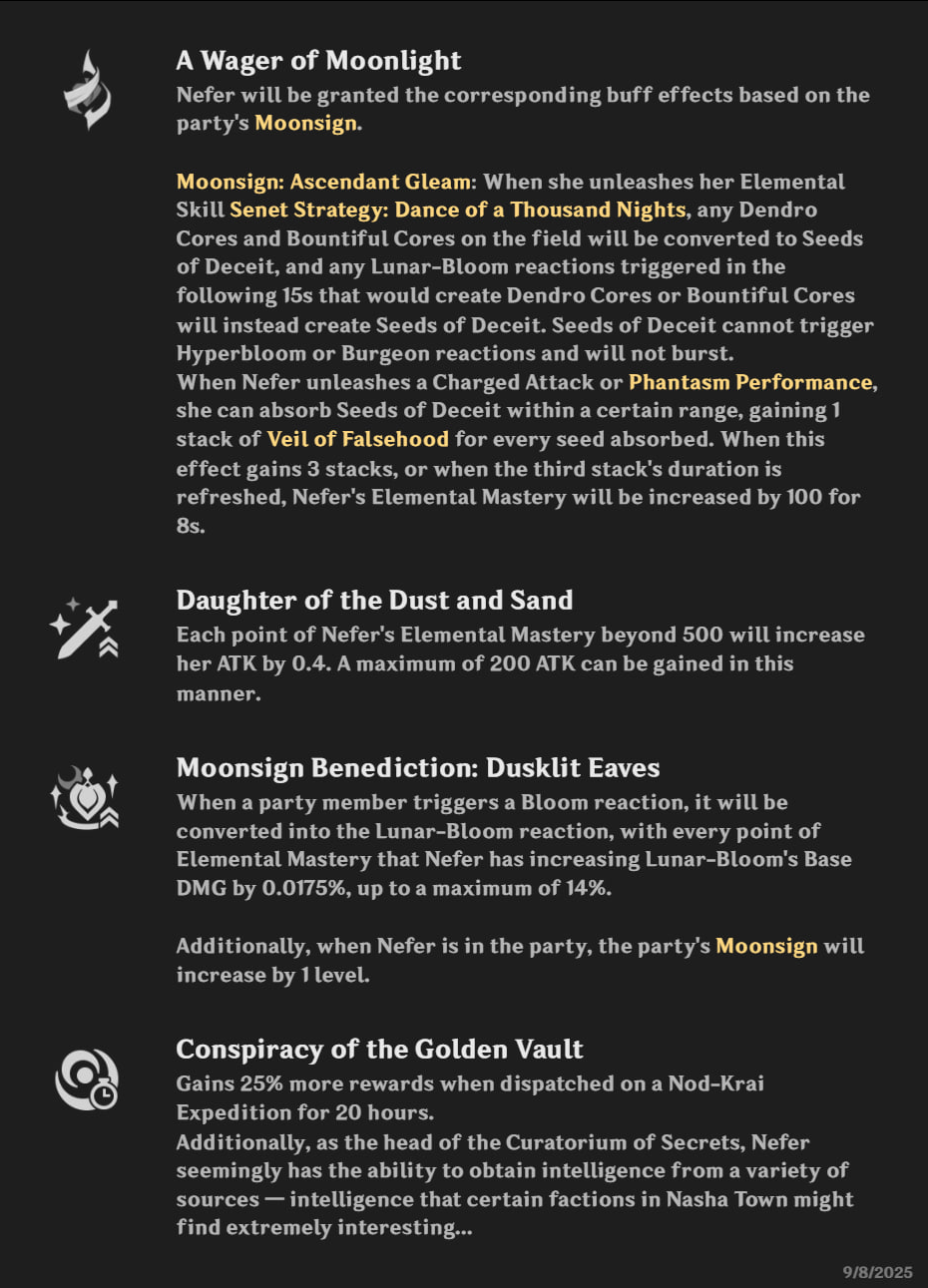 A Wager of Moonlight: превращает ядра Дендро в особые Seeds of Deceit (они не взрываются и не реагируют). При поглощении — стаки Veil of Falsehood (при 3 стаках +100 Мастерства стихий на 8 c).