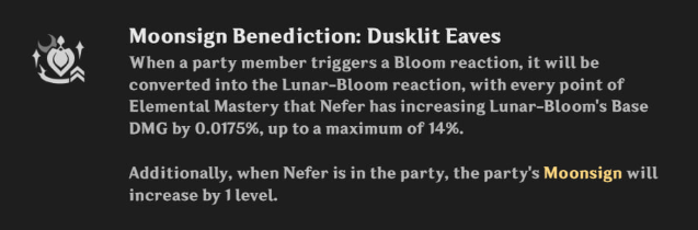 Moonsign Benediction: превращает Bloom в Lunar-Bloom (масштабируется от её МС). Даёт +1 уровень Moonsign.