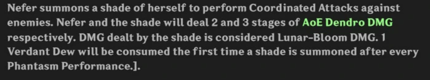 После Phantasm Performance наносит доп. AoE Dendro урон от МС (85% + 120%). Считается Lunar-Bloom уроном.