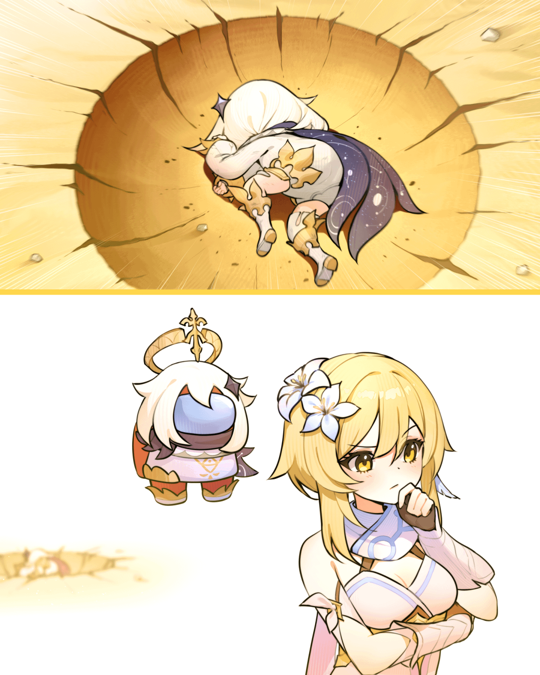 >Разработчики Genshin Impact в ответ на этот пост опубликовали изображение с Паймон и написали: «подозрительно, очень подозрительно».