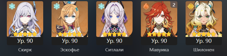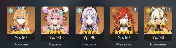 Милаха Качина, одно время часто бегала в дырку с Навией, пока не появилась Шилонен. Акула - после памперсов Фонтейна я был обязан это роллить прямо на релизе. Вот еще и сигну буквально на днях добил. Кинича не крутил, сигна упала случайно вместо жатвы. Жатва упала в итоге, но позже. Ситлали мастролл вместе с Мявуикой (о ней позже), оживила всю пиро стихию, даже бездамажный Тулуп задамажил. Одна из лучших сапов. Шилонен - одна из королев опена, одна из лучших сапов в игре. Наконец, просто красавица. Никто кроме нее не умеет танцевать вокруг шеста. Иансан - боль и проклятье. Да, она раздает хороший бафф и вообще полезна, но она просто не падала, хотя я довольно прилично закинул в баннеры Цапли, Коровы и т.д. Лор не сильно понял. Часка - еще одна королева опена, и даже может что-то в дамаг (но есть нюансы). Если гора не строго вертикальная - Часка уделает даже Шилонен. Оророн - забавный парень по лору, херачит норм электро из кармана, натланская Фишль. Архонт - ну Архонт. Капитан - ну Капитан.