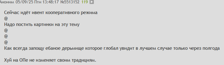 Сейчас идёт ивент кооперативного режима @ Надо постить картинки на эту тему @ @ @ Как всегда запощу ебаное дерьмище которое глобал увидит в лучшем случае только через полгода