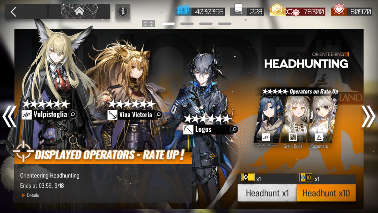 Баннер Orienteering Headhunting с 4 сентября до 18 сентября Суть баннера: вы выбираете трёх из шести предложенных в списке 6★ и 5★ оперативников. В случае 6★, выпасть в баннере могут только выбранные оперативники, в случае 5★, вы просто повышаете их шанс выпадения. 6★: Hoederer / Logos / Vina Victoria / Stainless / Viviana / Vulpisfoglia 5★: Lunacub / Fang the Fire-Sharpened / Warmy / Grain Buds / Kazemaru / Blacknight