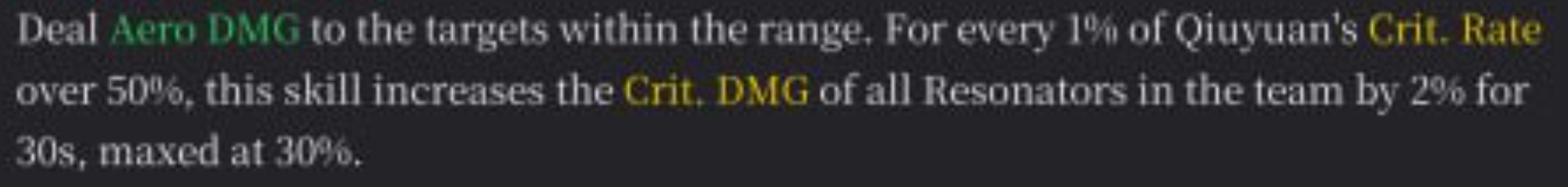 баффы цююаня: - ульта: за каждый 1% крит. шанса у цююаня выше 50% повышает крит. урон союзникам на 2%, до 30% на 30 секунд (то бишь для капа на цююане нужно всего 65% кш) - бафф к урону эхо для союзников при заполнении шкалы цююаня: +30% - аутро: +50% к урону эхо для следующего союзника