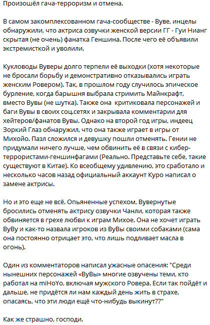 О чем вообще споры, какая-то баба работая на куро слишком много пиздела на компанию и занималась доксингом игроков, также была замечена в связях с официально признанной преступной интернет группировкой под флагом михое, за что ее собственно и поперли с работы. Михуешные англ актрисы тоже недавно много пиздели, за что их также выперли, их дефать будете или нет?