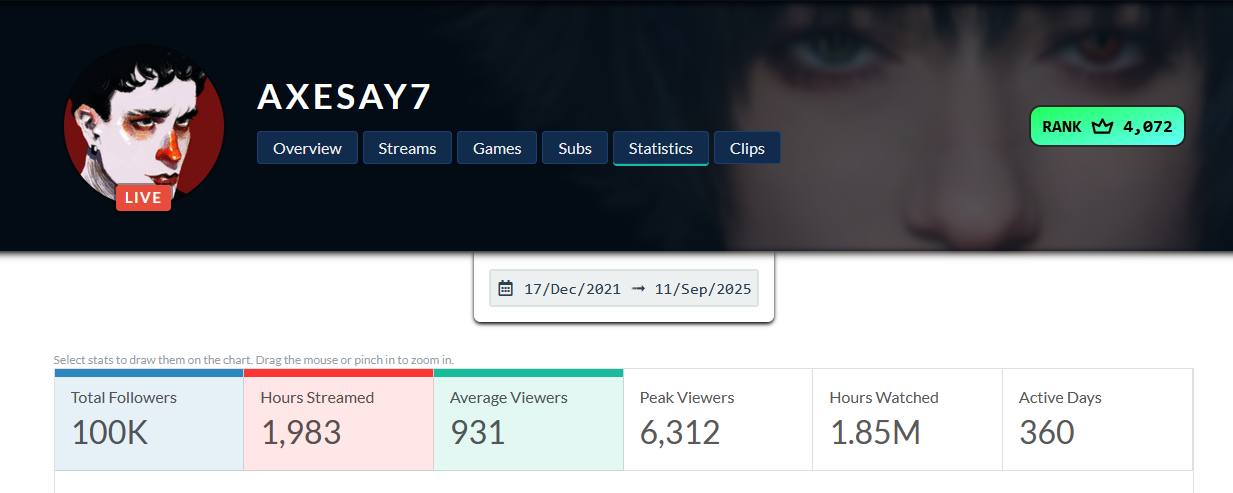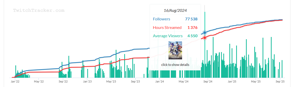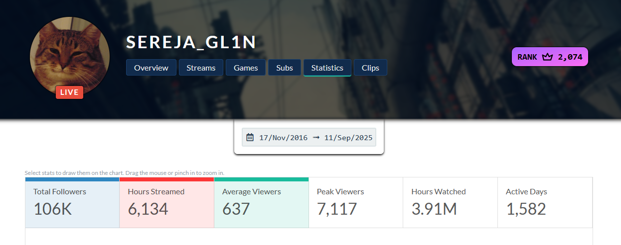 >>5548133 5 лет назад такого стримера по сути и не было, так что это все сказки для залетышей. В 22 году смотрел 100 человек. Один раз пик онлайна в один день случился 4,5к на абисс капе. Все остальные дни за последние пару лет у него онлайн 500-1500 человек. Еще раз повторю, никогда по геншину не было огромного онлайна ни у одного русского стриме. Игра популярная была, а стримы сами по себе никогда. Даже самые топовые английские стримеры не имели онлайна под 10к, разве что какой-нибудь тектон. Все остальные резко улетают в диапазон 1-5к. Что пять лет назад, что сейчас.
