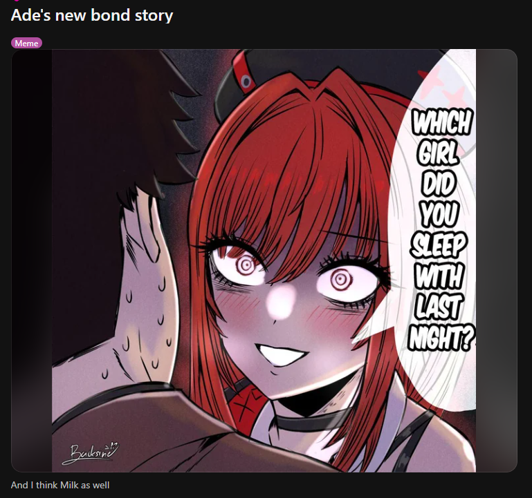 Я хочу развитие отношений в бондах, FI и адвайсах видеть, а не в общедоступных ивентах. Так у нашего буратино больше пространства для маневра появляется, а не как на пляже с Сакурой, где он слова спиздануть не может, чтобы статус-кво не нарушить. В итоге ни нашим, ни вашим.