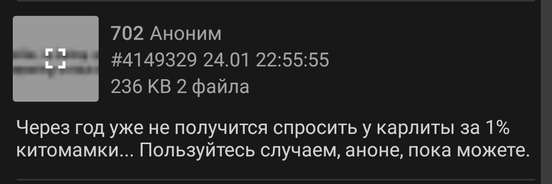 >>5514372 Охуенная история, братан, спасибо, что рассказал. Я вот через час работу заканчиваю, планирую взять три бутылки пива по 0.5 объёмом после этого. Выпью за твоё здоровье и чтобы РКН тебя не беспокоил в жизни сильно.