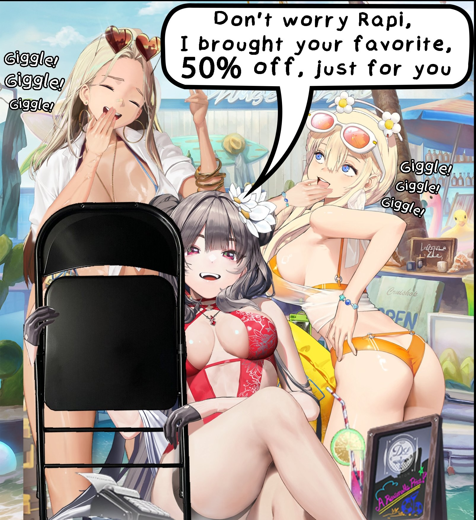 > НЕКАНОНИЧНЫЙ ШКИКАН > пригрел на себе Беечку > оценивает милоту Милки в баннисьюте и красоту Адечки > извращенка Руж что-то там мямлит про удачу, сверкая перед ним почти ничем не прикрытыми телесами > в целях конспирации хватает за жопу Аде и нагло играет пальчиками по телу Милки > после мига опасности вместо извинений обещает полапать попозже > томной главзлодейке на всякие предложения предлагает встать в очередь > его обаяние даже сквозь маскировку чувствует Содочка > КАНОНИЧНЫЙ шкикан > бедная Рапичка надевает купальник как у Сакуры, прикрыв грудь почти прозрачной футболкой > томно смотрит на субъект воздыхания, хватает за ручку и тащит в темный уголок при любом удобном случае > шкикан ведёт себя немногим активнее лежащего на складе Майти тулз швеллера > бедная девочка убегает к подруге своей наставницы в надежде получить утешение, проёбываясь половину эвента Нет повести печальнее на свете, чем повесть о проёбанном тобою лете. Тогда никто не выиграл, но рапифаги проиграли больше всех. Наверное, надо бахнуть в Милку и Аде все билетики и прочитать бонды, но я хочу растянуть удовольствие от созерцания лучшей мейды и её задиристой товарки