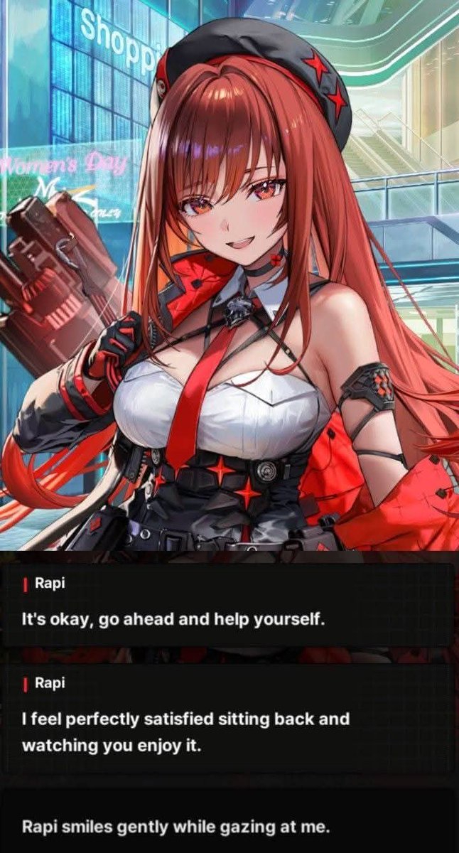 >>5549475 Так даже романтику не завезли, я про поебушки молчу. С Рапи у шкикана примерно ноль взаимодействия. А вот закончить эвент посиделками вдвоём на фоне заката под шум веселящейся компании было бы идеально. Хотели развития? Вот оно вам. Но по итогу соснули все. Кстати, шутки про кукчейр я не одобряю. Это не куколдство и не измена, ведь с Рапи нет настолько близких отношений