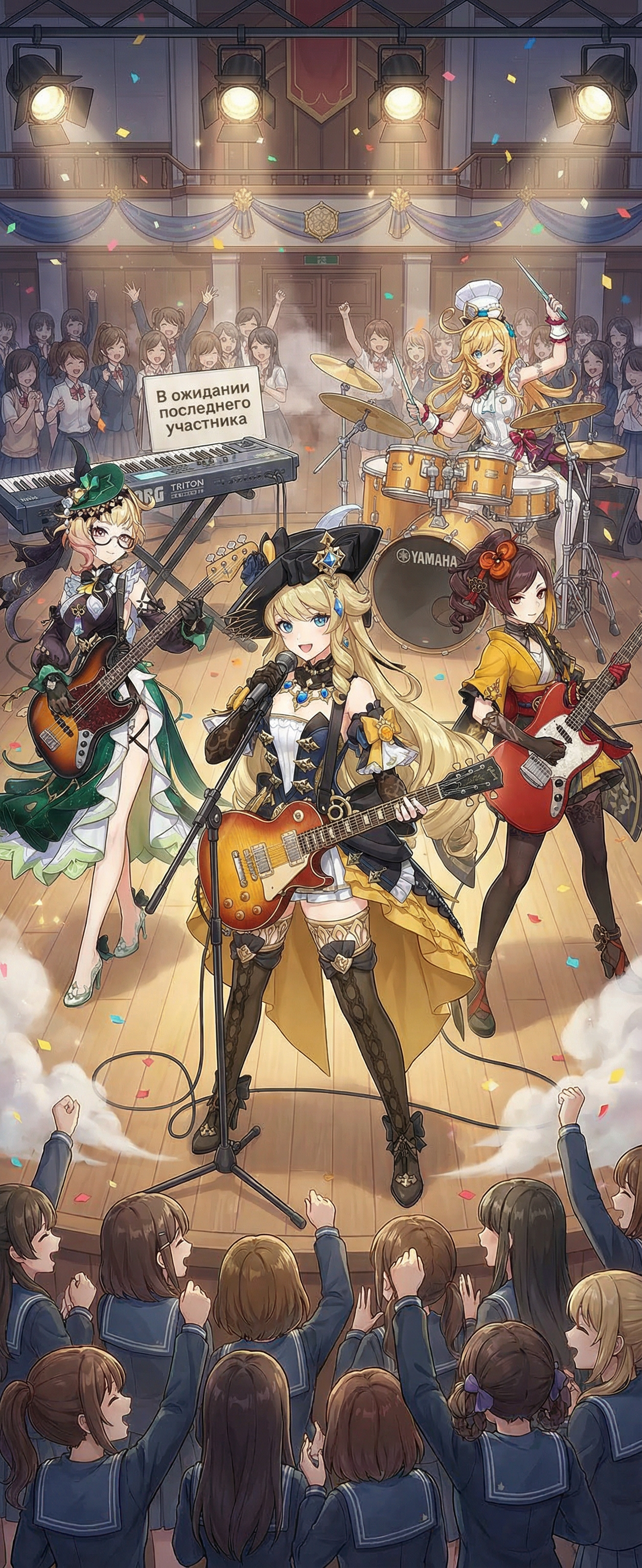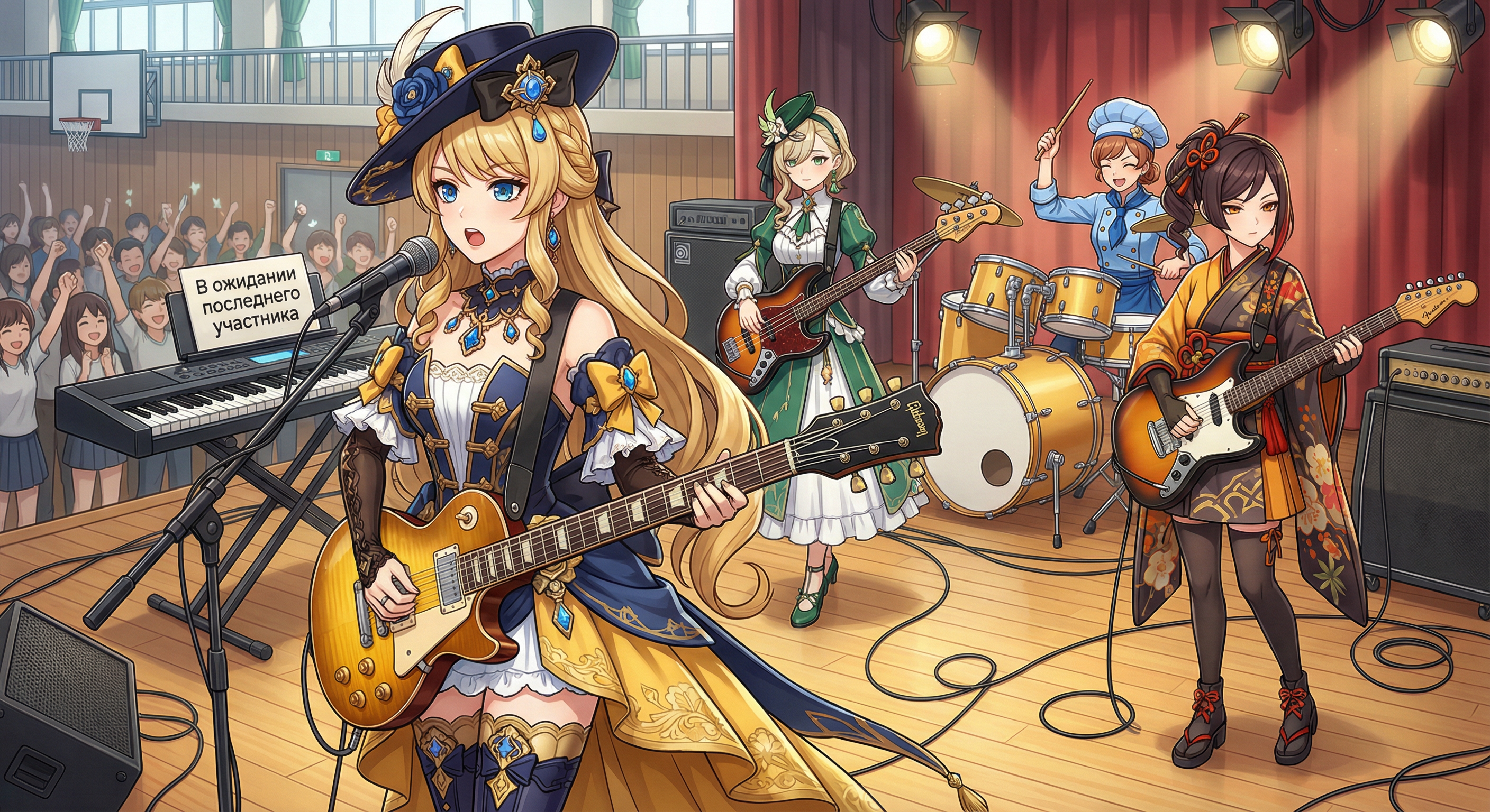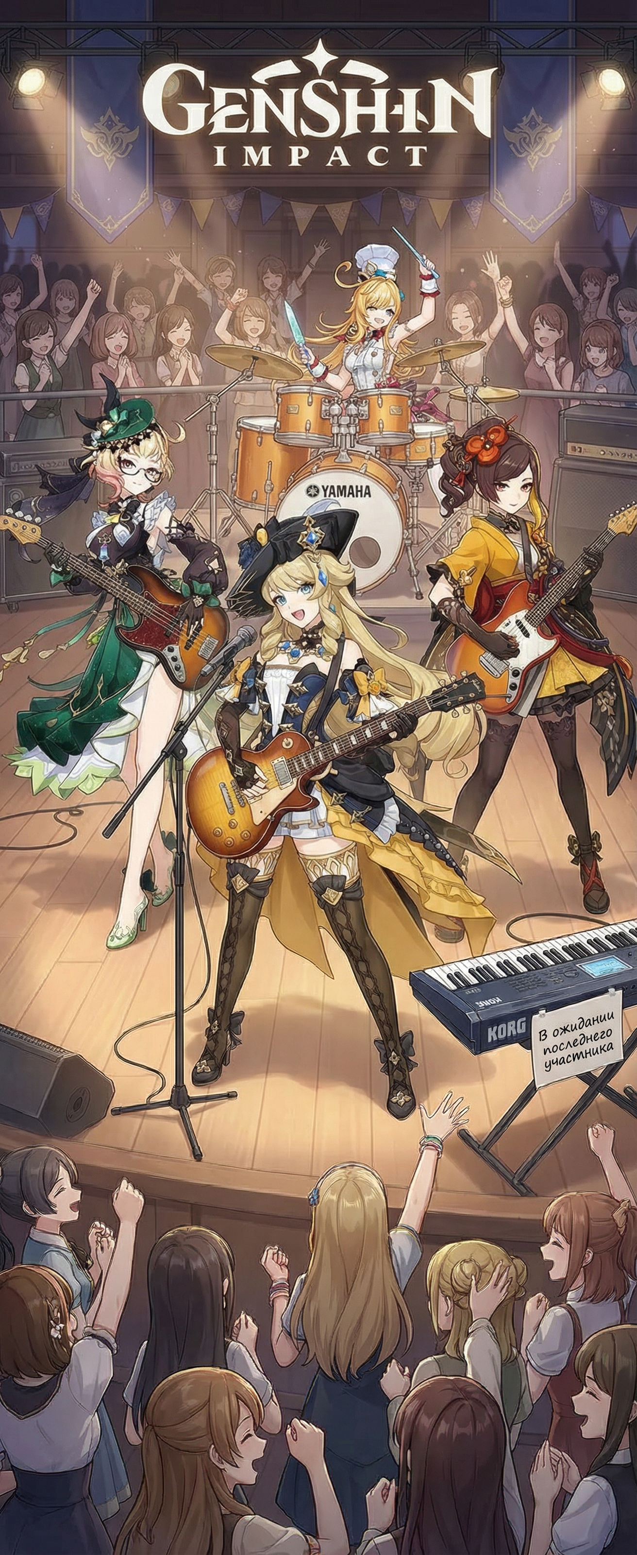 Якобы перерисованная сцена из аниме K-on, где девочки выступают на сцене. Вместо Юи - Навия (Navia from Genshin) из Хоровод импакта. Электрогитара. На переднем плане. Вместо Мио - Эмилия (Emilie from Genshin) из Хоровод импакта. Бас-гитара. Вместо Азусы - Тиори (Chiori from Genshin) из Хоровод импакта. Электрогитара. Вместо Рицу - Эскофье (Escoffier from Genshin) из Хоровод импакта. Ударные. За клавишами вместо участницы табличка "В ожидании последнего участника".