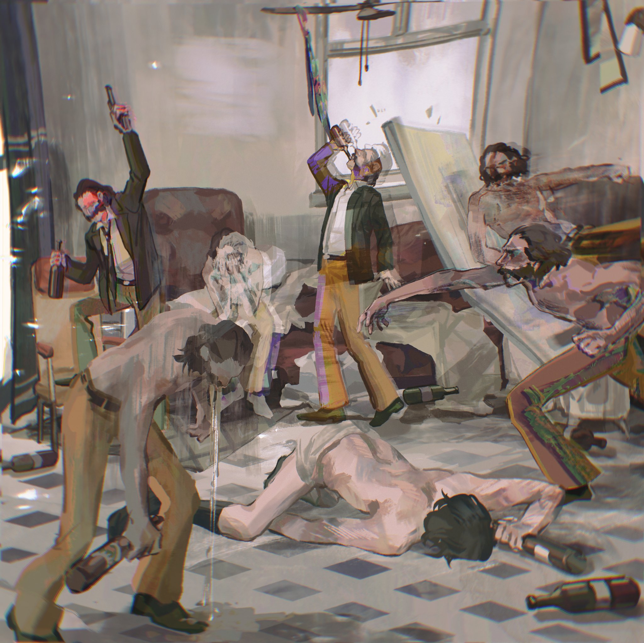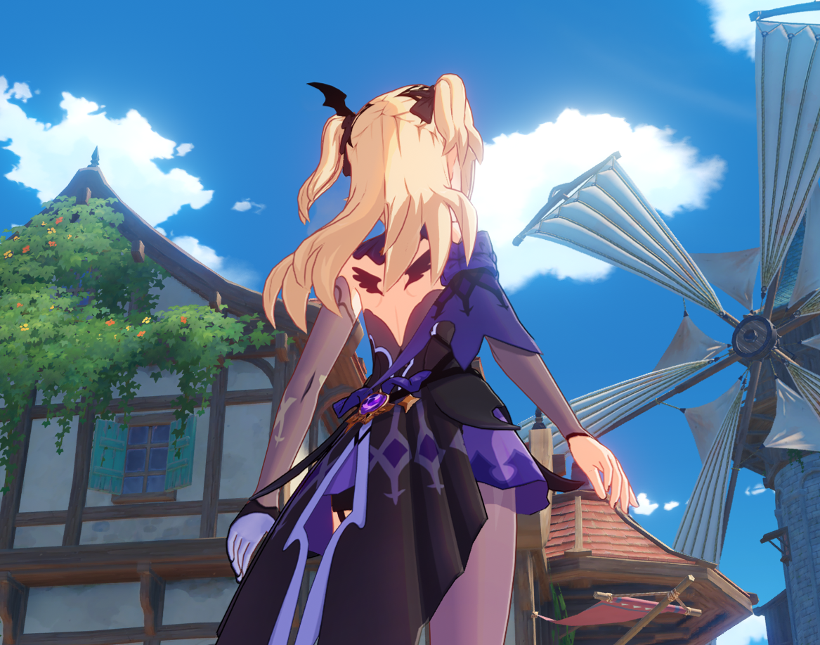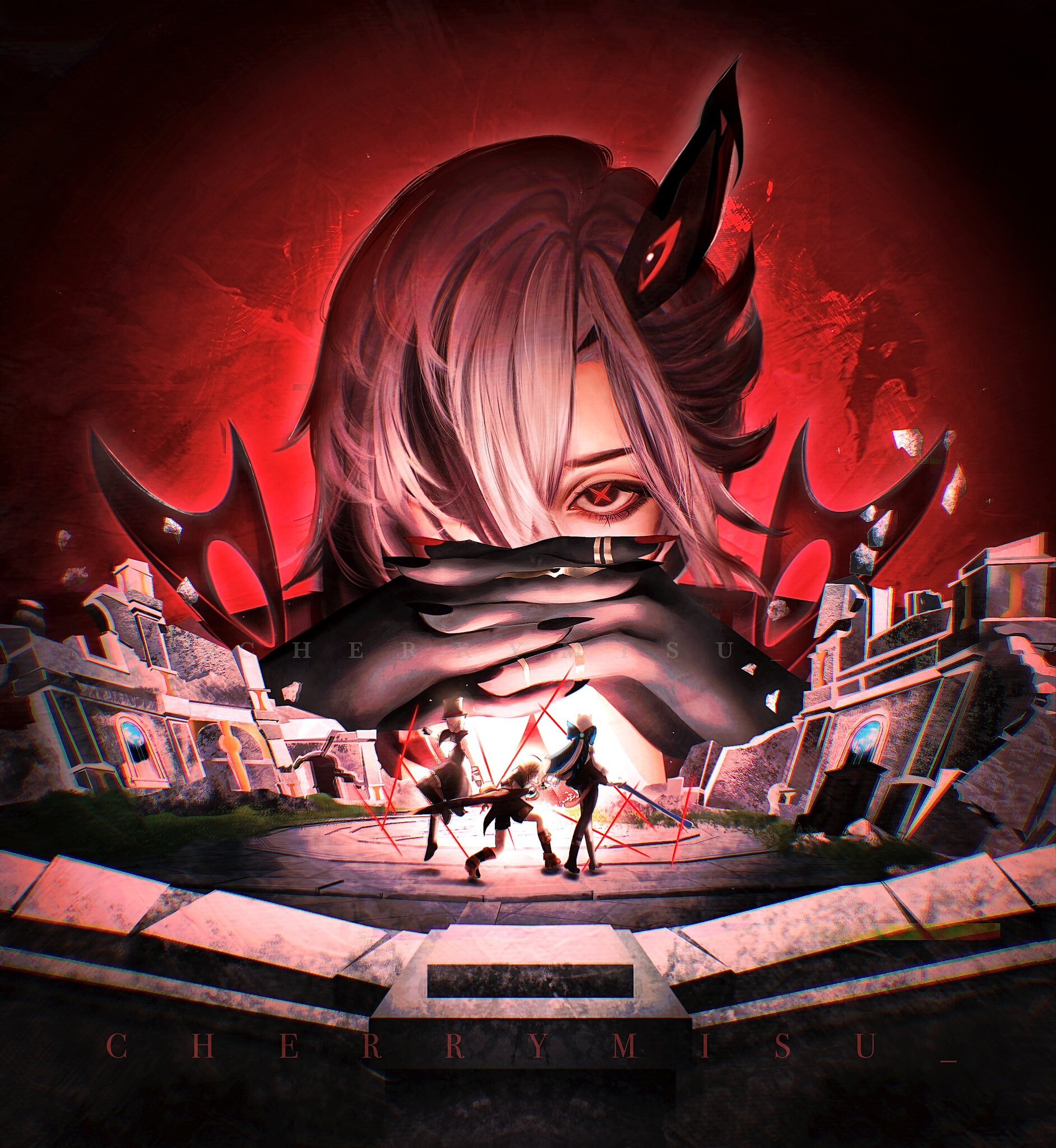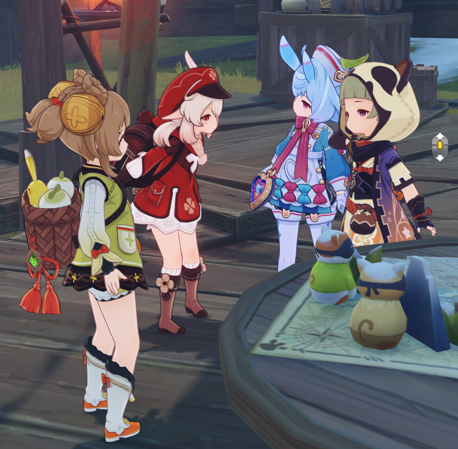 Якобы перерисованная сцена из аниме K-on, где девочки выступают на сцене. Вместо Юи - Навия (Navia from Genshin) из Хоровод импакта. Электрогитара. На переднем плане. Вместо Мио - Эмилия (Emilie from Genshin) из Хоровод импакта. Бас-гитара. Вместо Азусы - Тиори (Chiori from Genshin) из Хоровод импакта. Электрогитара. Вместо Рицу - Эскофье (Escoffier from Genshin) из Хоровод импакта. Ударные. За клавишами вместо участницы табличка "В ожидании последнего участника".