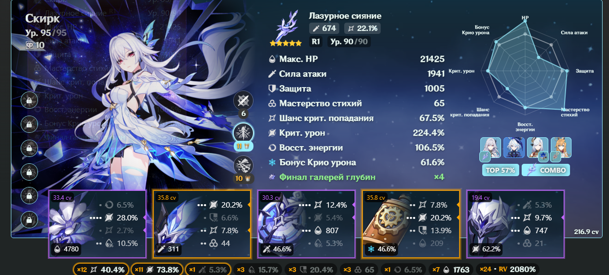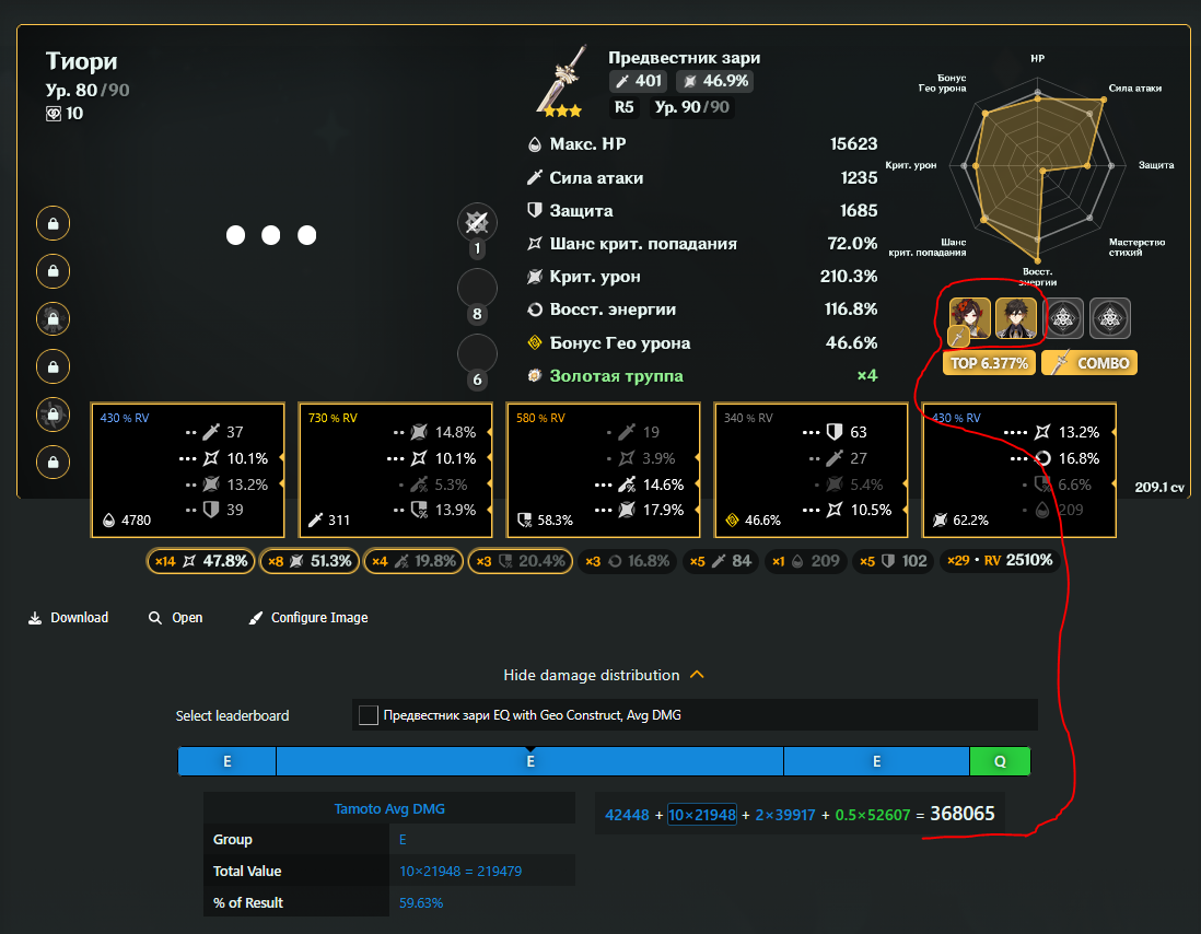 Вы же тут часто про Акашу и рейтинги в ней говорите. Подскажите. Почему только топ-6%? Я не представляю, куда мне и как улучшать результаты. Тут нужны какие-то невероятные четырёхстатовые арты с жирнющими проками, чтобы что-то заменить и улучшить. И это же борьба не за первые позиции, а чтобы хотя бы топ-5% попасть. Почему так? Мне однажды говорили, что это из-за того, что не очень многие выкрутили Тиори с волшебной палочкой. Но все кто выкрутили являются дикими энджоерами героини и потому вложили в неё много сил. От того и конкуренция жёстче. Якобы у популярных героев, где больше загрузок разных сборок, с этим проще.