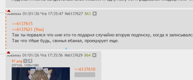 >>6137615 >>6137621 Так ты порвался что мне кто-то подарил случайно вторую подписку, когда я записывался к емичу условному. Так что тИше будь, свинья ебаная, проецирует еще.
