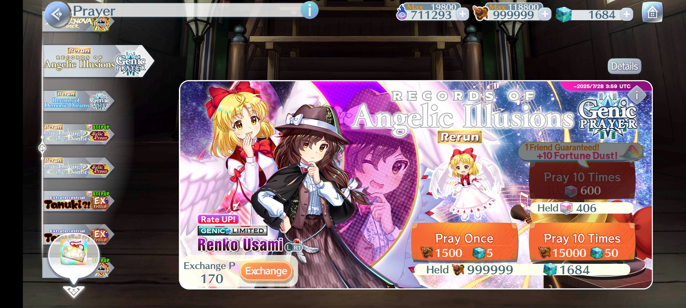 >>5218135 >рероллить не буду Зря, потом жалеть будешь. >>5218135 >Кого мне крутить посоветуете? Сейчас Gengetsu (Renko), девочка с белым ангелочком сзади (спереди - ренео, сзади-Генгетсу). Если Касен еще падает, то её, она даже сильнее немного. Вообще в целом новогодняя мариса Сейчас самая сильная в игре, но на данный момент баннера нет.