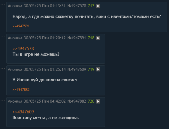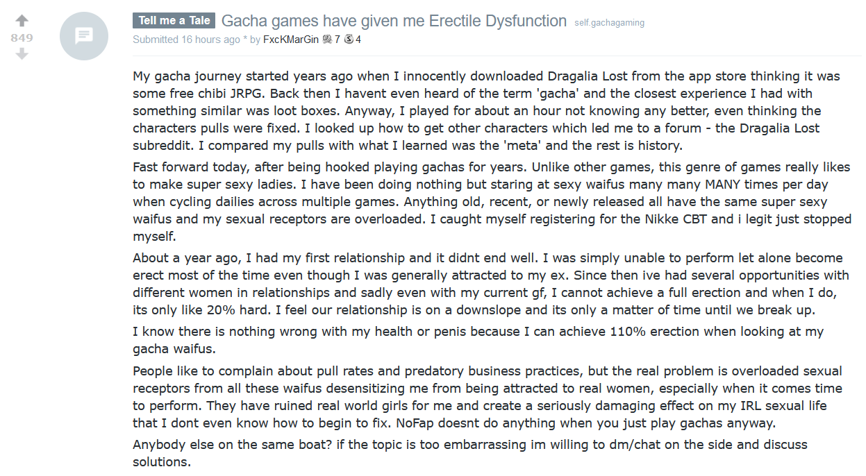 Там не только пипирка не стоит на 3d.. Я тут еще подумал, эти проклятые гачи - тотальный куколдинг в кубе, особенно архив. Есть баба виртуальная, а ее даже потрогать нельзя в самой игре, нельзя с ними взаимодействовать, нельзя сближаться, нельзя романсить, ничего блять нельзя. Ебаный зацикленный кибергулаг, в котором пиликаешь каждый день дейлики ради красивого спрайта, с которым нет развития, как это в нормальных vn, никогда не будет концовки, никогда не будет развития отношений. Как проклятая крысы с электродом в мозгу в зоне дофамина, жму каждый день педальку и все. Куколдинг на куколдинге с фильтрами и барьерами, еще и локализаторы сверху ссут. И это осознание сводит с ума. Я сейчас такую дозу апатии депрессии словил аж морду скрючило.