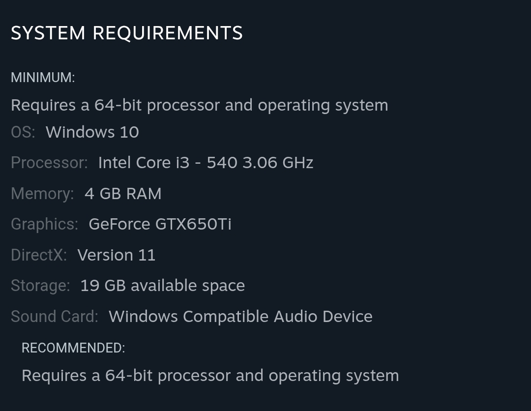 >>4966851 Так минимальные требования обычно завышают, указывая на какой системе игра точно запустится. Учитывая, что там указана 650я и 4Гб оперативы, то скорее всего можно будет и на 210й запустить, либо аналогичной заглушке.
