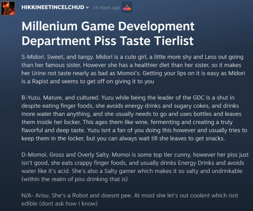 Ох, утро сегодня по-настоящему доброе, каеф. "Педобазовички" даже итт умудряются резонировать тряску, блядь, от виабупроблем, от того, что нпс в катсцене, которую сами все скипнут, пискнула, когда лямку от лифчика засветила, немного не с той октавой, ещё и для пущего копиума навыдумывали инцелов. Душа радуется от очередной драмы в кинетик вн без сюжета и геймплея. Ещё пара драм и в архиве до еоса останутся только 3,5 дяди сясьсея, которые будут только друг друга ебать в мужской флетчест.
