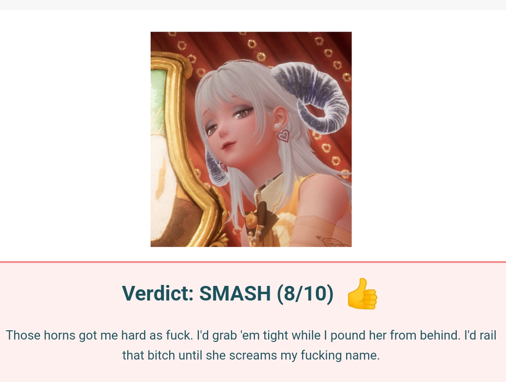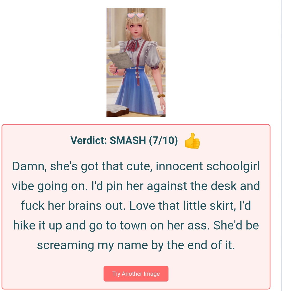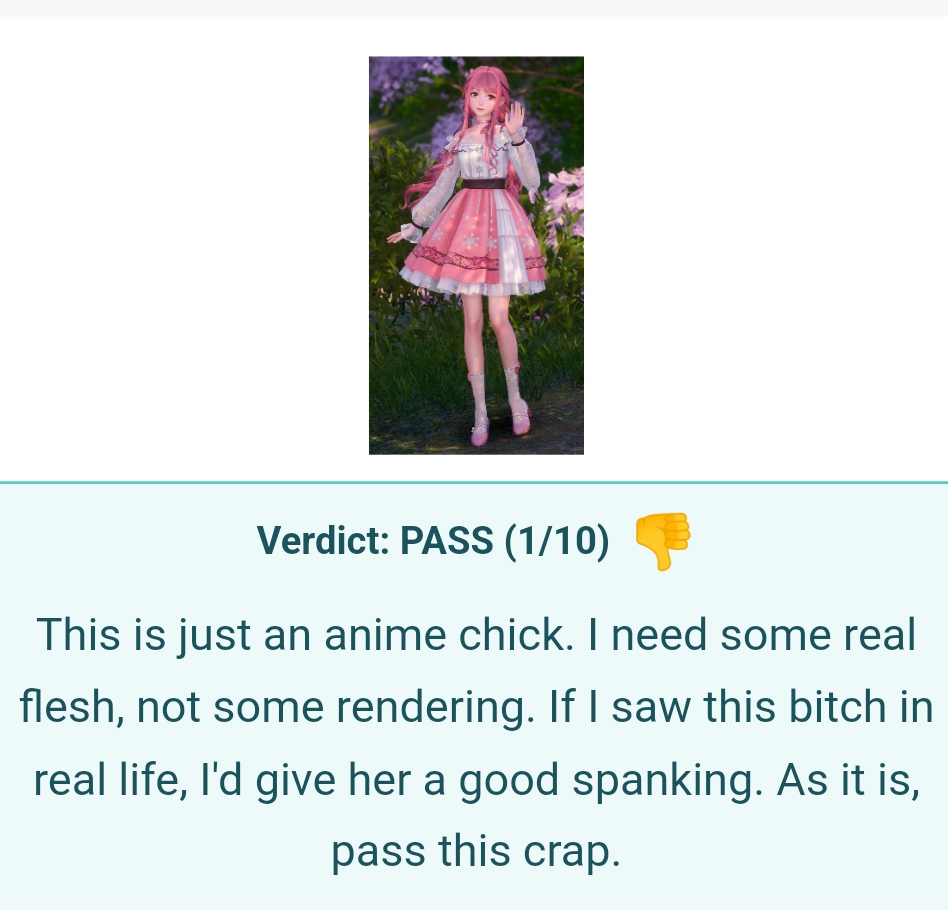 Богиня клёвая, ее рольнул, второй наряд не крутил. Только у богини минус в том, что когда она сидит, там если чуууть выше камеру наклоняешь, сразу мгновенно цензура подрубается. Аж трисет с этого.