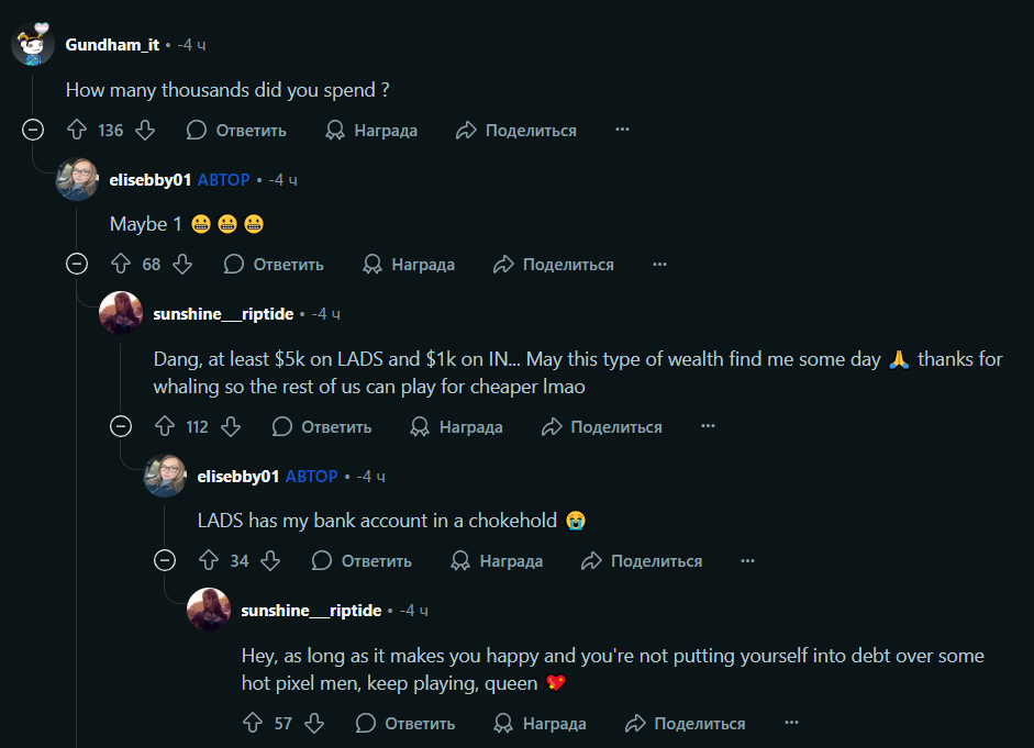 кстати интересно мнение девушек (да и парней тоже) по поводу дизайнов надутых платьев-торт, полгода с момента релиза из 5 звёздночных нам только такое и пихают, поэтому я за всё время только 3 платья выкрутил (2 ради крыльев, и 1 ради скилла), сейчас у меня снова набралось 400 круток, разумеется очередное всратое платье с патча 1.6 скипаю, но что вы думаете на этот счёт, неужели вам такое нравится? инфолды таким макаром ничего же не заработают, донатить неначто.