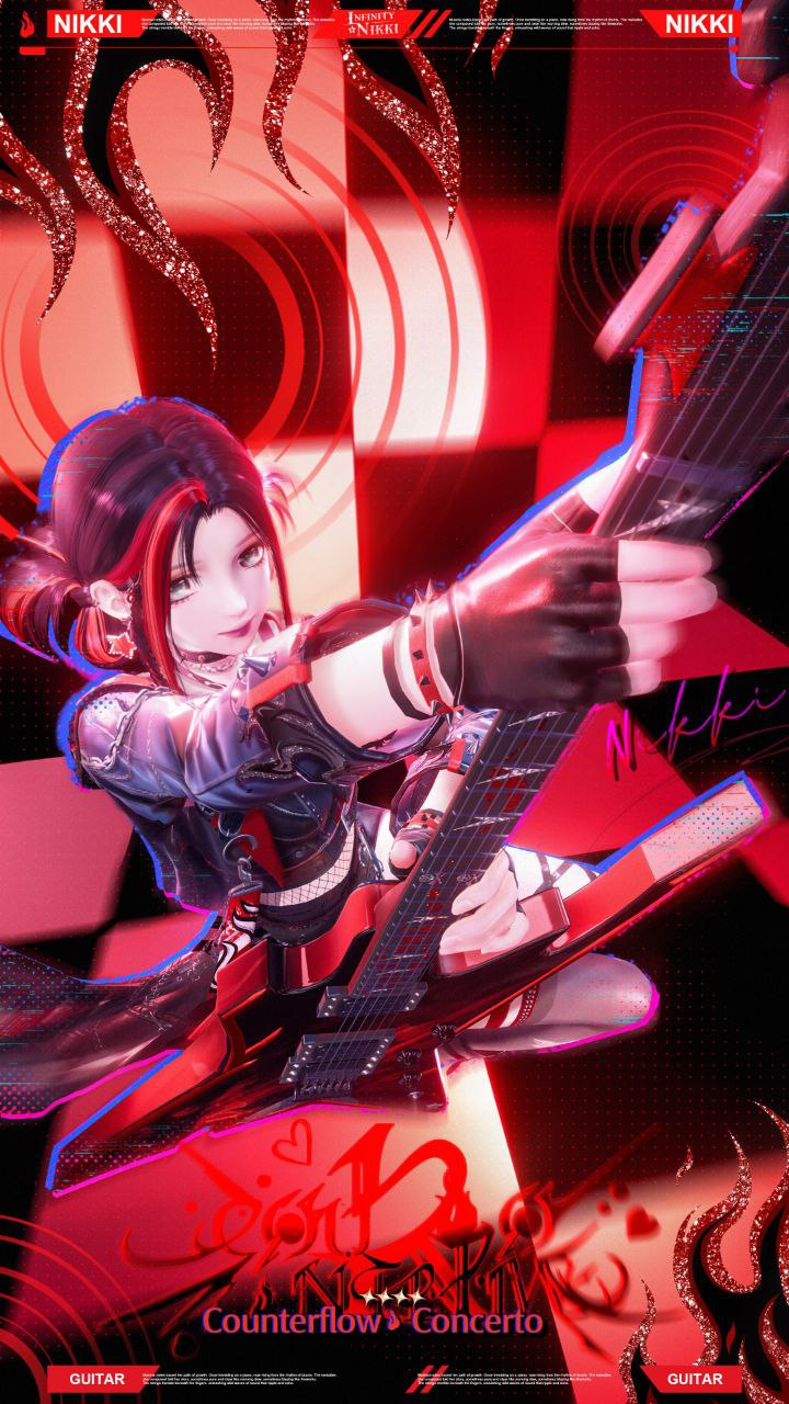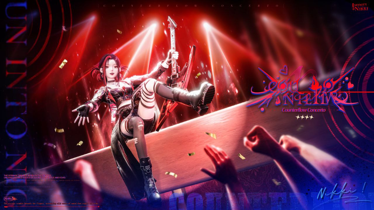 4зв баннер - Counterflow Concerto Основной атрибут: Cool Способность наряда [По умолчанию: Электрогитара]: Струны дрожат под пальцами, высвобождая дикие волны звука, разливающиеся эхом. После активации способности Никки входит в режим выступления. Играй или удерживай разные ноты, чтобы исполнять множество мелодий. Меняй эффекты гитары прямо во время выступления, превращай её музыку и выпускай безудержный музыкальный вихрь за пределами воображения!