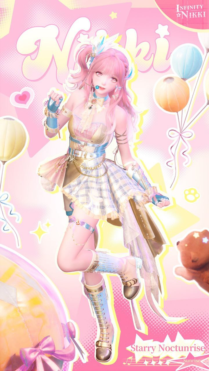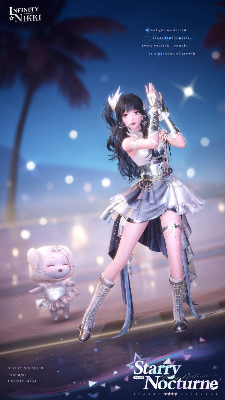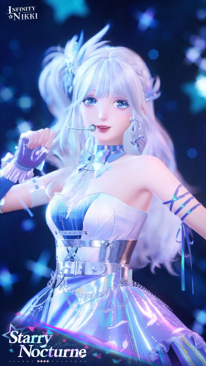 4зв баннер - Starry Nocturne Основной атрибут: Sexy Способность наряда [Ослепительный прожектор: причудливость]: Нежно сжимая микрофон и стоя на сцене, сотканной из радужного света, позволь голосу подняться вместе с мелодией, ярко расцветая в сиянии. После активации способности Никки может вызвать ослепительную сцену мечты. Вращайся, прыгай и пой, пока звук и свет не сольются в грандиозное представление!