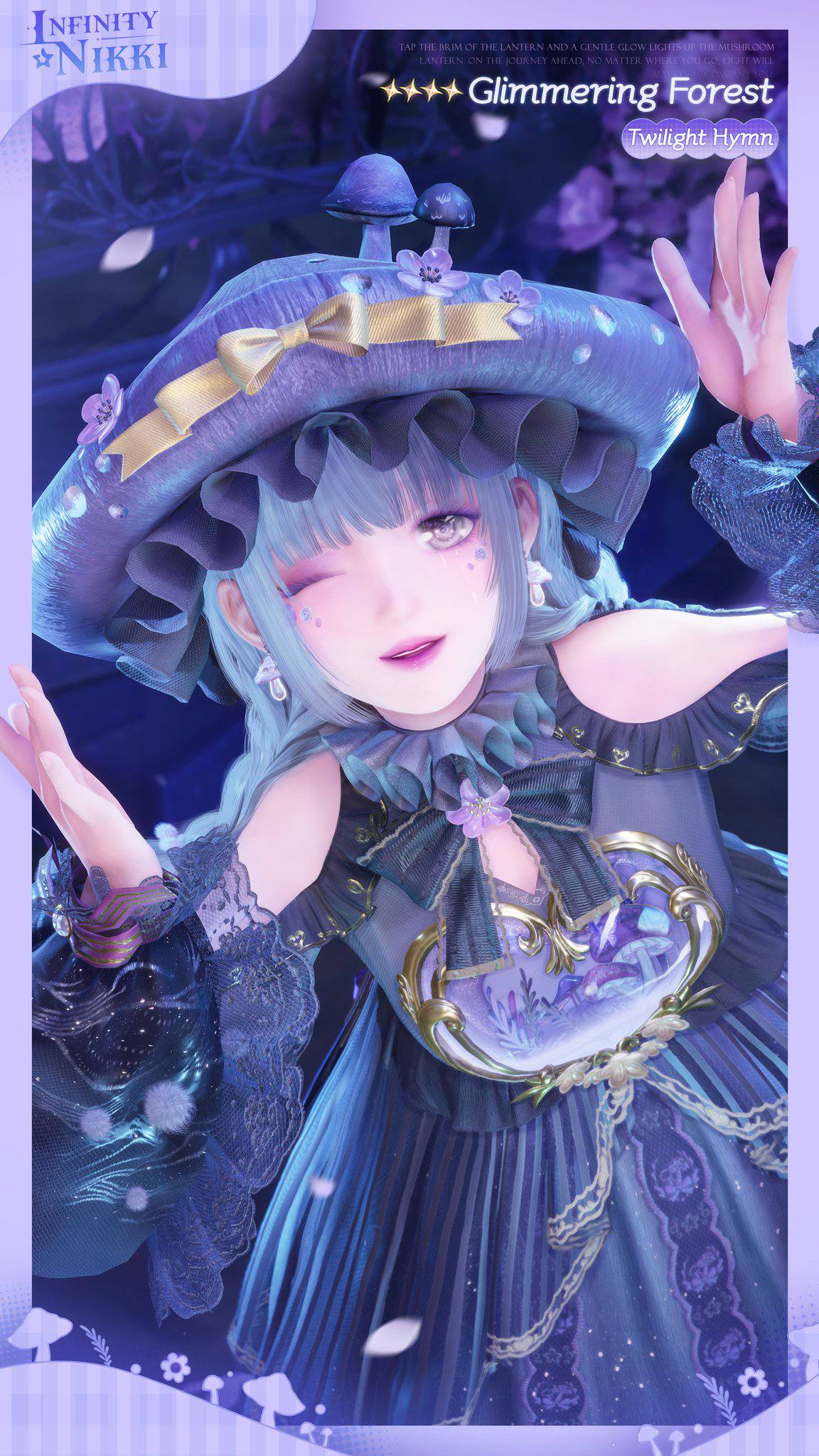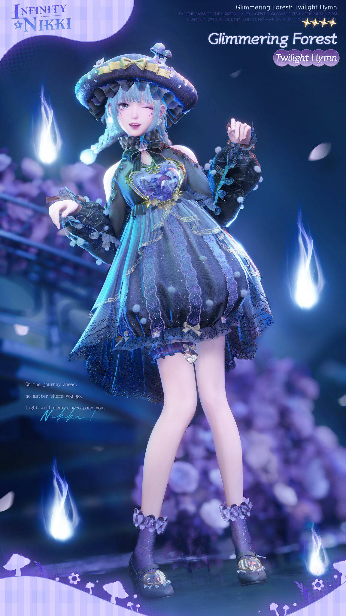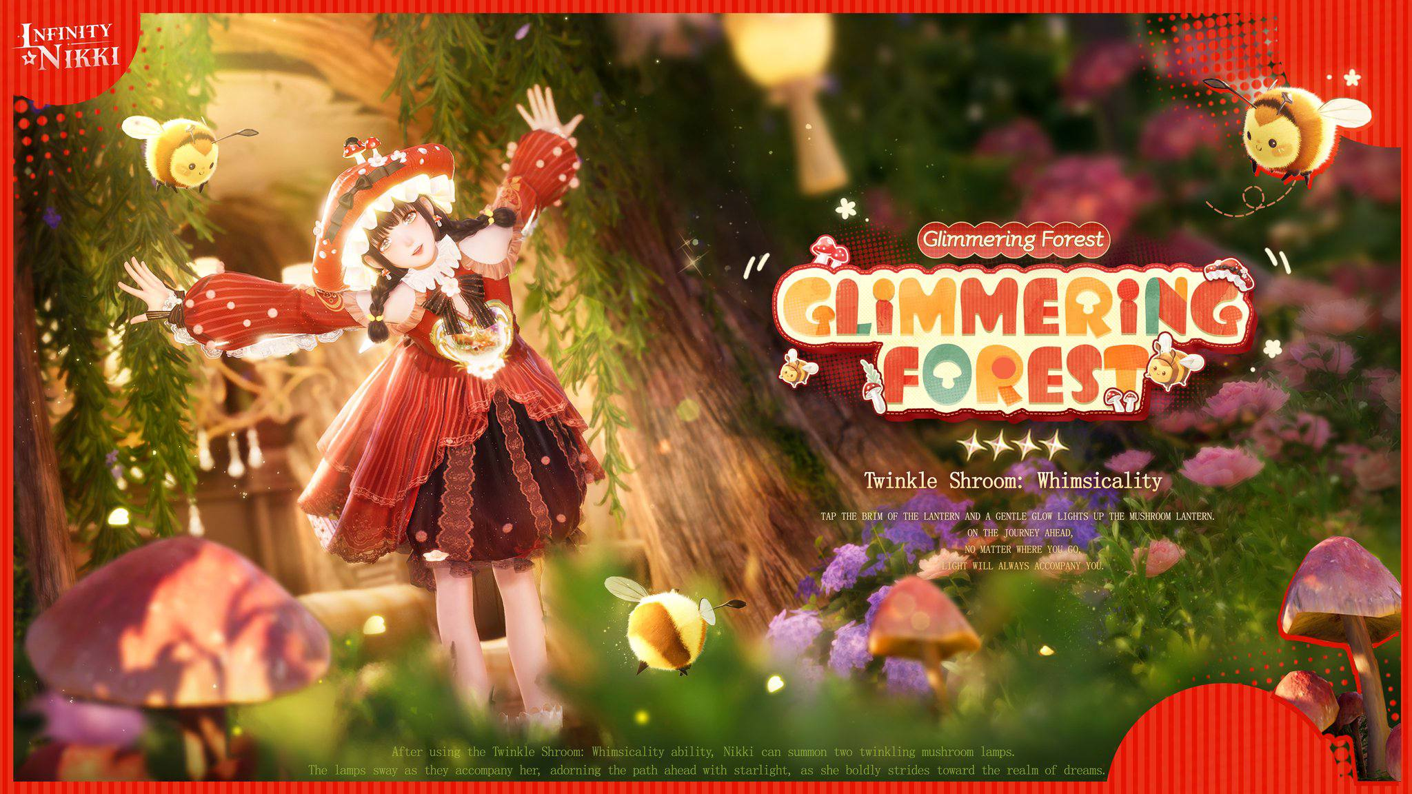 >♾️ Причудливый наряд | Сияющий лес >Основная характеристика: Sweet >Даже красный цвет может дышать мягко — в этот момент он разлился в небольшой купол. Светящиеся споры танцевали на нём, словно звёзды-светлячки, вечно парящие без отдыха. Рядом колыхались два мягких огонька, освещая легенды леса. >🍄 Способность наряда >[Сверкающий гриб: Причудливость] — коснись края фонаря, и мягкое сияние зажжёт грибной светильник. На грядущем пути, куда бы ты ни направилась, свет всегда будет рядом. После активации способности Никки может призвать два мерцающих грибных фонаря. Они покачиваются, сопровождая её, усыпая путь звёздным сиянием, пока она смело шагает навстречу царству грёз.