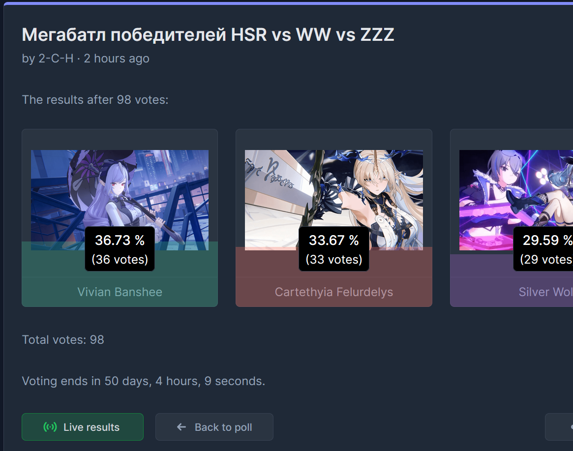 >>5207856 Я не играю ничего кроме ззз, но проголосовал за другую тяночку, хоть и не знаю кто это такие вообще. Просто потому что мне пиздец как не нравится виви.