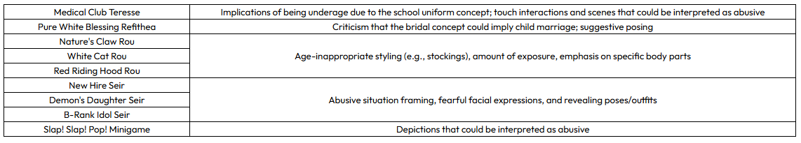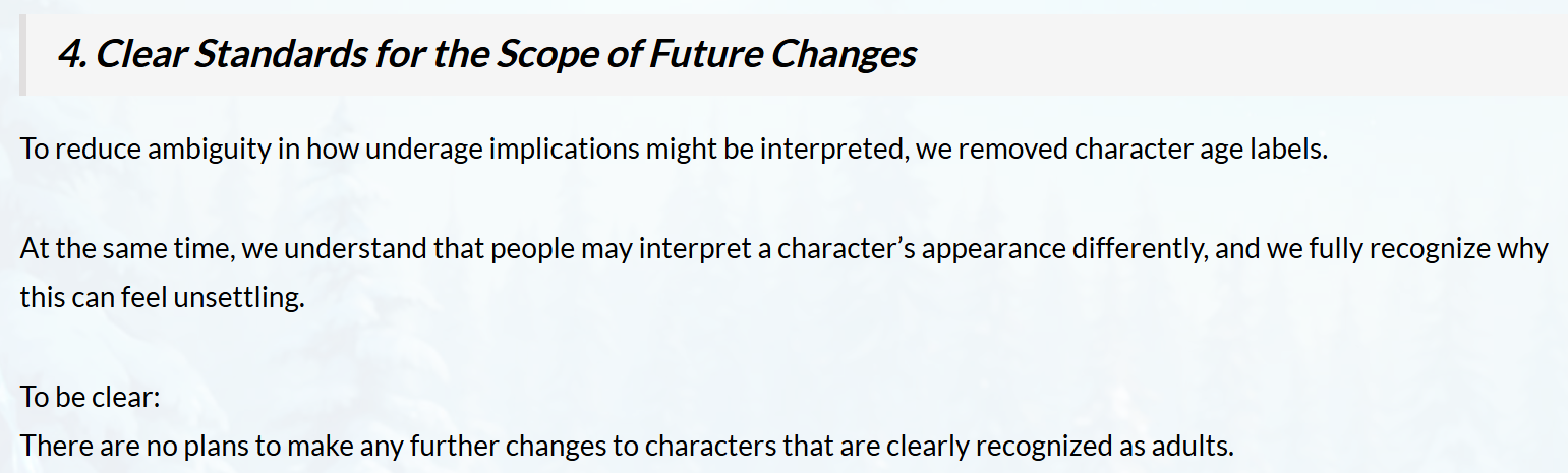 If, due to specific country or platform requirements, it becomes impossible to maintain service without requiring changes, we will not alter character designs. Instead, our service policy will be to apply country-specific restrictions, suspend service, or provide an adapted build as needed for that country.