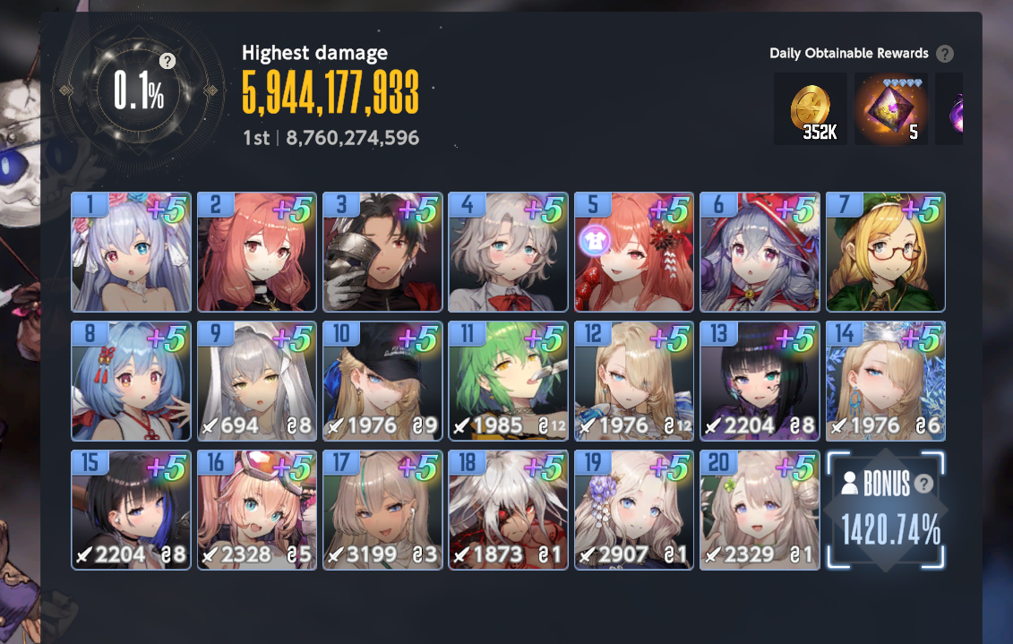 >>5691988 Шмот расставил? В этом режиме он не совпадает с тем, что у тебя в остальной игре. И для бонуса надо распихать абы какой вообще всем персонажам. Ну и разница в разлоченных потенциалах и дублях.