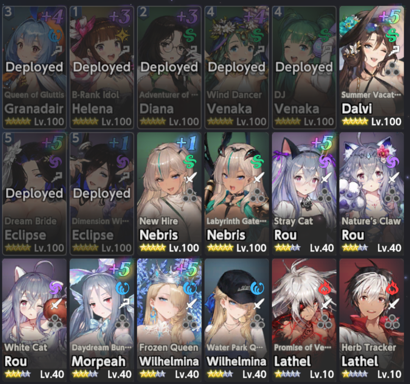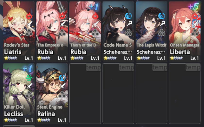 Раз тут советов мудрых раздают, аноны, можете подсказать нормально ли собрался в пвп или что другое поставить можно? Уже довольно долго сидел с офисной Мишей и код нейм Шехерезадой, но заебало болтаться между руби 1 и даймондом 1, наверно можно уже сапфир занюхивать? Сейчас у меня такая тима, Элианир правда +2 пока, следующим селектором доберу +3 и возможно тогда можно добавить что-то еще? Сейчас у меня Лафель бафает 1, пляжная Жустия бафается 1 и Элианир на 3 шлепает. А всего у меня вот такой суповой набор, может заменить кого.