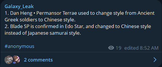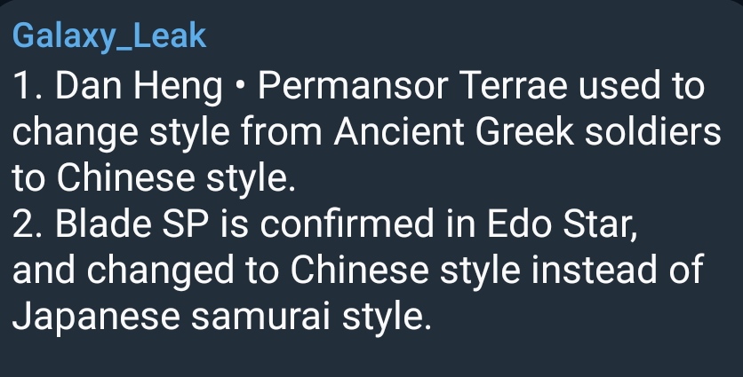 1. Дань Хэн СП ранее имел стиль древнегреческих воинов, но его изменили на китайский 2. Блэйд СП подтверждён для Эдо, и его стиль изменили на китайский вместо японского самурайского