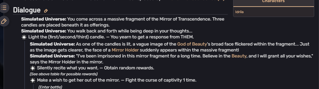 И именно потому существуют эти сраные зеркала. "Держатели зеркал хранят набор Зеркал запредельности. Вместо того чтобы отражать материальный мир, они показывают истинную красоту именно так, как она выражается в глазах смотрящего. По словам Держателей зеркал, эти зеркала были когда-то частицами божественной формы Идрилы. После смерти богини красоты её частицы оказались разбросаны по космосу."