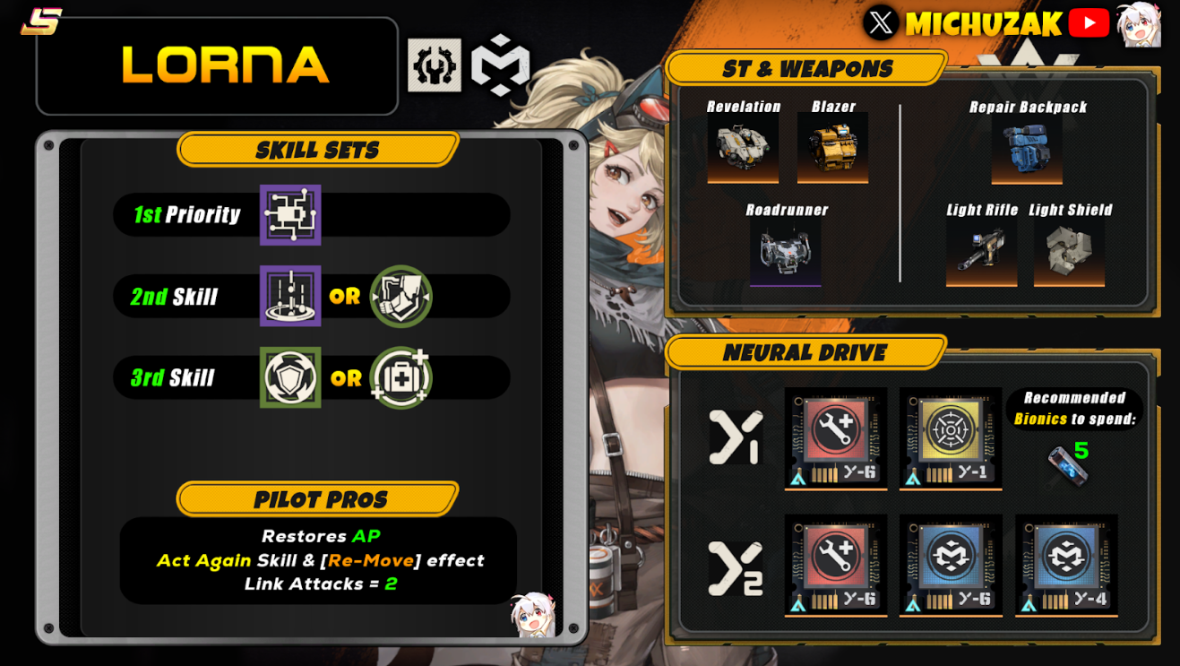 Прокачал на полную Лорну и пока все равно в основном с Милиссой бегаю. Её хил двух мехов в любой точке карта, где они б рем не находились, очень часто помогает. Буст АП и повторный ход это хорошо, но её держать рядом надо. А с Мелиссой можно дать Сильви и Фриде убежать на другой конец карты со спокойной душой и все равно подлечивать.