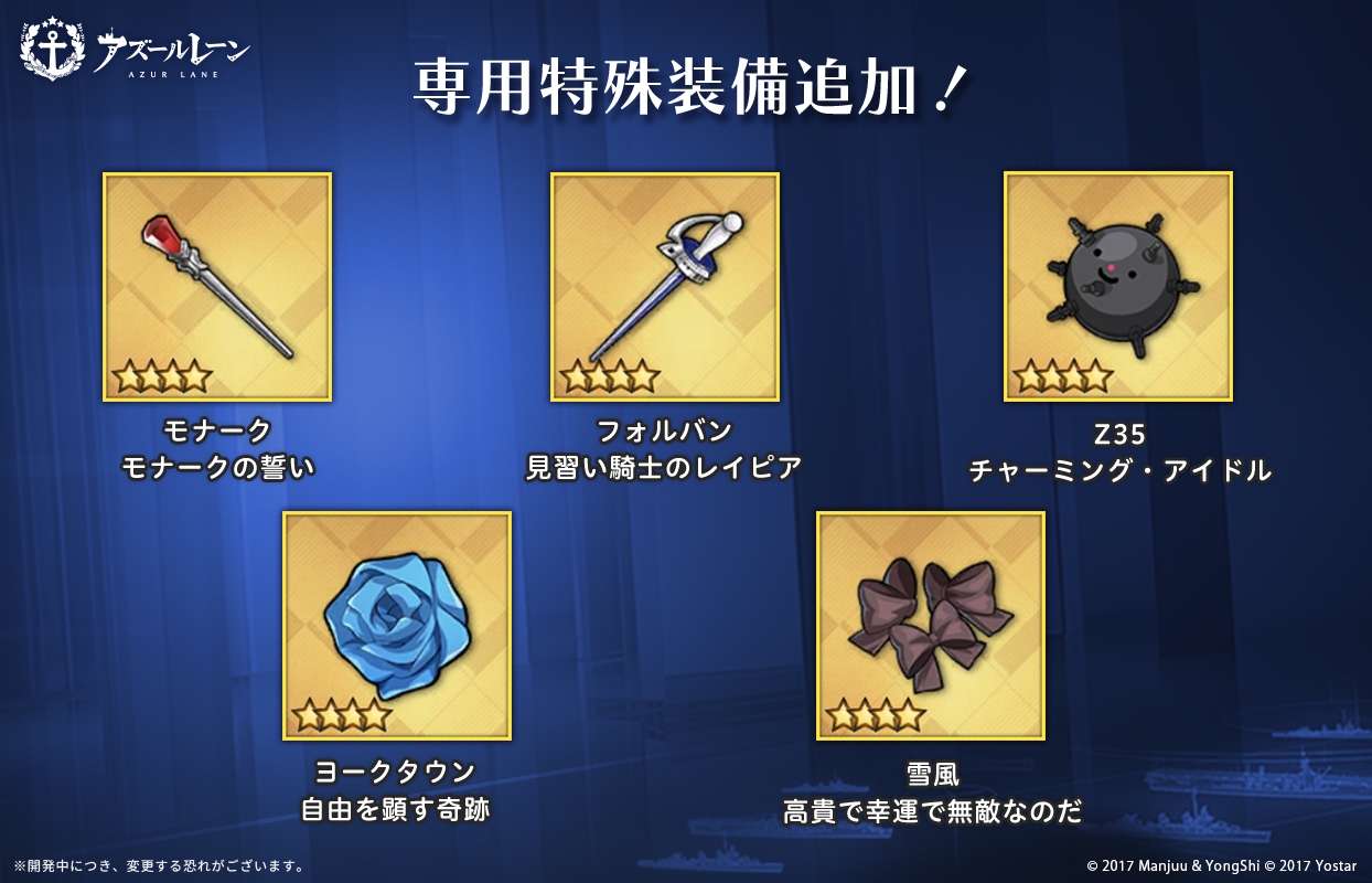 Monarch: The Oath of Monarch Yukikaze: Noble, Lucky, and Invincible Yorktown: The Miracle that Manifests Freedom Z35: Charming Idol Forbin: Apprentice Knight's Rapier