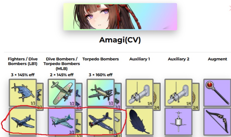 Амаги: У нее просто самолетики под тяжелую/медиум броню. Файтеры/Дайвы (3 самолета, ставим дайвы ибо файтеры только против легкой), Дайвы/Торпеды (2 самолетика, используем для таймингов), Торпеды (3 самолеты). В общем ее набор просто не позволяет ее собрать в авик против легкой брони, ибо там нужно много файтеров, а у нее всего один файтер слот, причем второй слот слабый по эффективности и кол-ву самолетов. У Амаги чистый дайв/торпедо набор.