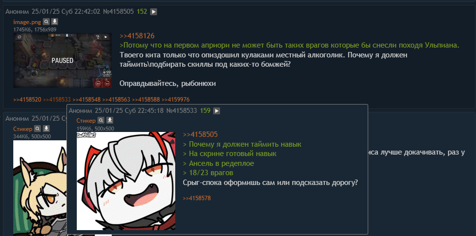>>5565931 Пробовал. Сосёт. Не может убить даже сраные хуевины на планы. >>5565883 Нарантуя с Тифон работают, да. >>5565843 Эксия просто вжушк, без Е2 полнейшая параша в рогалике. Альтер не вышла. Шварц не траил. Лемуэн не вышла. Сакики ты сука рофлишь? Рей, Цеобака не траил. Гавиальтер охуенно просто тащит рогалик, доаааа. Тифон ок. Виртуоза хуй сосёт как соло дд и до Е2 и после, ей слишком специфический сетап нужен. Аскалон ок, работает до Е2. Логос ну так, ну хотя бы дамажит. Ульпыпа ок, но он мили и закрывает один лейн только до Е2. Юй ну типа лучше чем ничего, но такое. Мда.