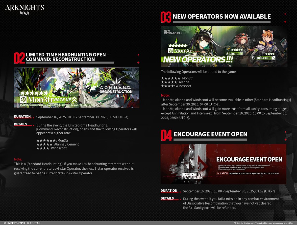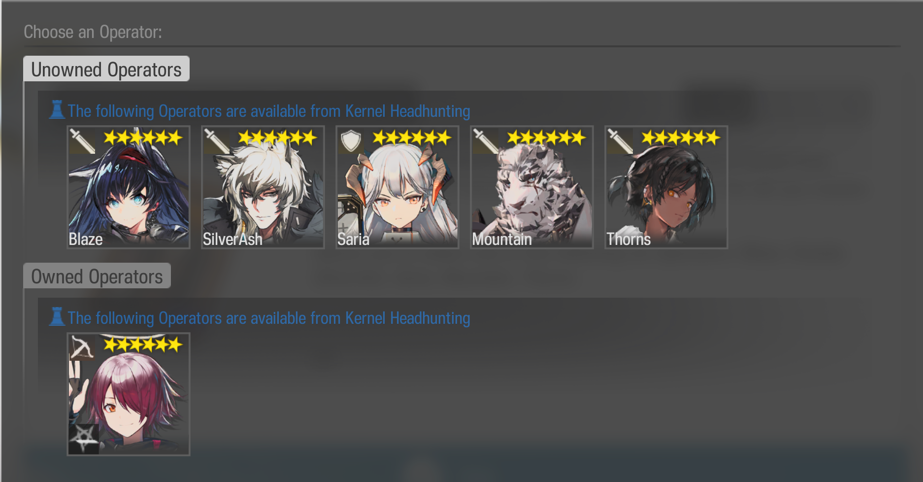 Баннер Orienteering Headhunting (до 18.09.2025) Суть баннера: вы выбираете трёх из шести предложенных в списке 6★ и 5★ оперативников. В случае 6★, выпасть в баннере могут только выбранные оперативники, в случае 5★, вы просто повышаете их шанс выпадения. 6★: Hoederer / Logos / Vina Victoria / Stainless / Viviana / Vulpisfoglia 5★: Lunacub / Fang the Fire-Sharpened / Warmy / Grain Buds / Kazemaru / Blacknight