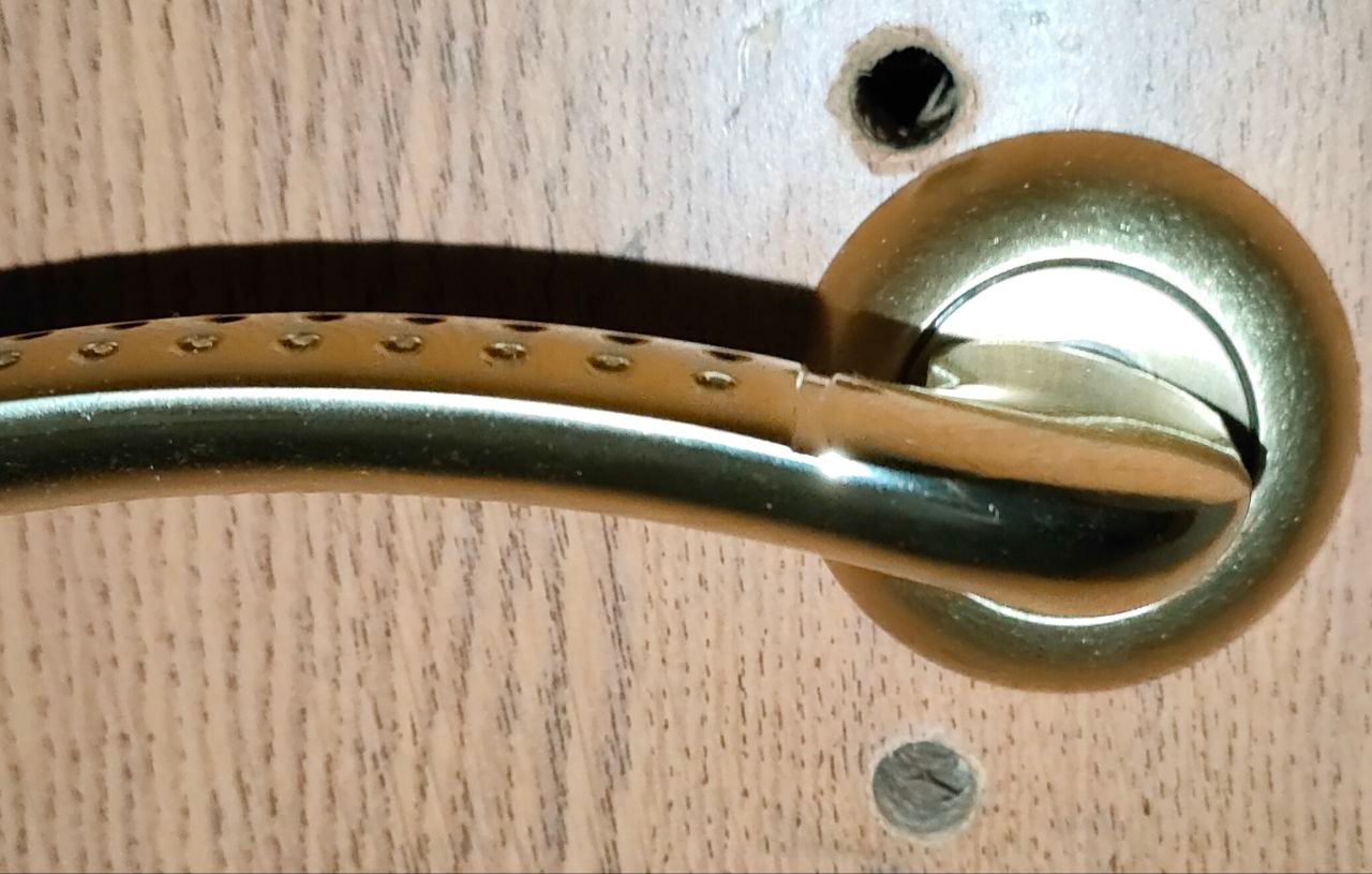 только теперь надо дырки от старой ручки как-то закрыть на двери (кроме скотча и пластилина)....