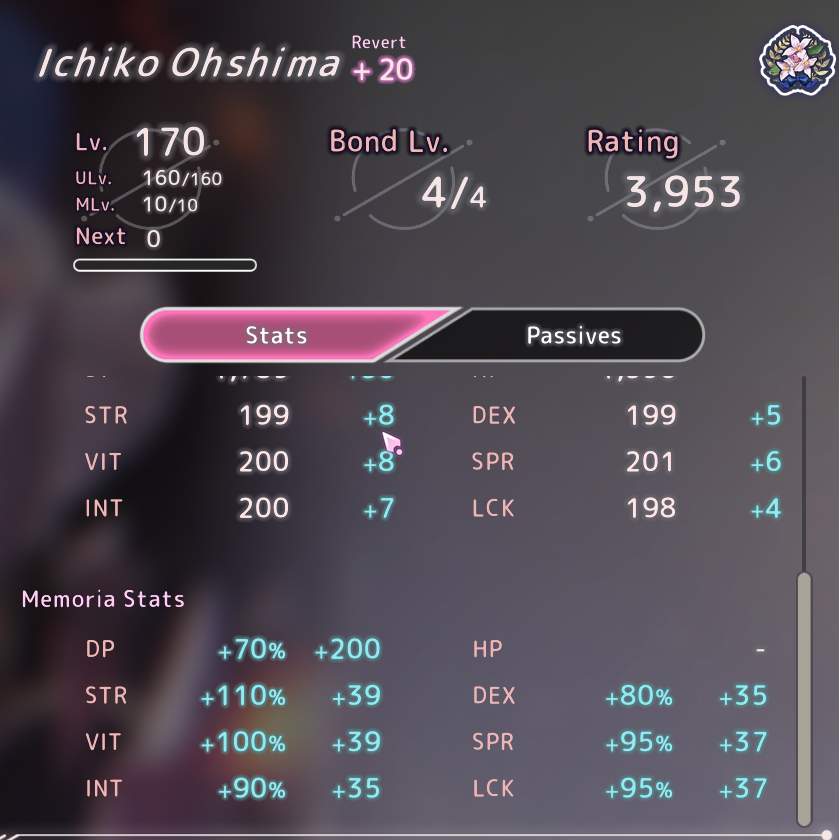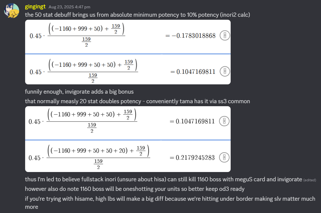 Важный длинно пост по механикам статов. Пока я анализировал скиллы, я задался вопросом а что значат все эти цифры пикрил. И решил посчитать что значат эти +39 внизу и как они в финальную цифру складываются. И когда посчитал то понял очень неочевидную вещь, касаемо лбшек и развития персонажей. Это может быть полезно тем кто собирается развивать аккаунт горизонтально в том числе. Тем, кто не понимает разницы между разными источниками статов. Если коротко сформулировать что я понял: 1) Каждый +1 стат это эквивалент +1 уровню. Все флет +х статов умножаются об проценты в нижней табличке мемории. Все кроме флетов в нижней табличке, потому что они уже умноженные. 2) Каждый +1 к реверсу это тоже эквивалент +1 уровню. 3) Лбшки дают не +10% к статам а около 6% на лб1, и с каждой последующей меньше и меньше. 4) Самое полезное что они делают это увеличение капа уровней на 10, то есть 10 статов. 5) Лбшить на фул имеет смысл только 1 раз в любой мемории. 6) С баджей +1 к статам работает также как те пассивки которые глобально передают между мемуриями по 7+ статов, например силы. 7) Шмотки влияют не так сильно как хотелось бы, их флеты не умножаются но и не прокачивать их смысла нет, это обычная небольшая прибавка, которая передается между персонажами по ситуации. Теперь дебри: Эти условные +39 внизу это сумма эксклюзивных флет +статов за прокачку мемории, умноженная на процент слева. То есть готовая цифра. Если их разделить на этот процент и подставить в табличку глобальных +статов выше будет то же число. Реверсы не пишутся нигде как стат бусты а просто молча суммируются к статам за уровни. 20 реверсов это 20 уровней персонажу даже без лбшек. Просто они делают одно и тоже - дают статы. +8 Силы в верхней табличке пикрила это посути те самые глобал статы открытые с A S SS1 и т.д. меморий, баджики. В +% внизу пишется буст с мемории что часто колеблется в районе 60% - 40% безо всяких лбшек и прочего. Лбшки переоценены потомучто если максимальный уровень уже открыт то эти +10% это всего лишь сумма к имеющимся +60% и т.д. Тоже самое относится и к глобал пассивке за лб4 сс1, и дафне. То есть чем больше ты добавляешь процент тем меньше пользы за каждые +10%, это китам на заметку. Апать до лб4 самый профит это сс1 как не странно. Другим сс достаточно лб1, дальше уже мизерные прибавки. Теперь по передаваемым статам. Условная мемория Адель каждого элемента передает глобально своему юниту около 7 силы. Это все равно что 7 уровней. Они умножаются об проценты как если бы это были родные статы с уровней. 3 Адели сс1,2,3,4? держи 30+ уровней по сути в плане дамага. Собрав всех Аделей ты получаешь больше эквивалента уровням по урону чем лбшнув на 2 какую нить единственную Мари на аккаунте. Это может быть полезно тем кто хочет пробивать пороги но ищет оптимального персонажа под разные элементы. Как то так надеюсь кому то помогло понять статы. Сам я из этого понял что мог идти намного широким аккаунтом без потери в силе персонажей.