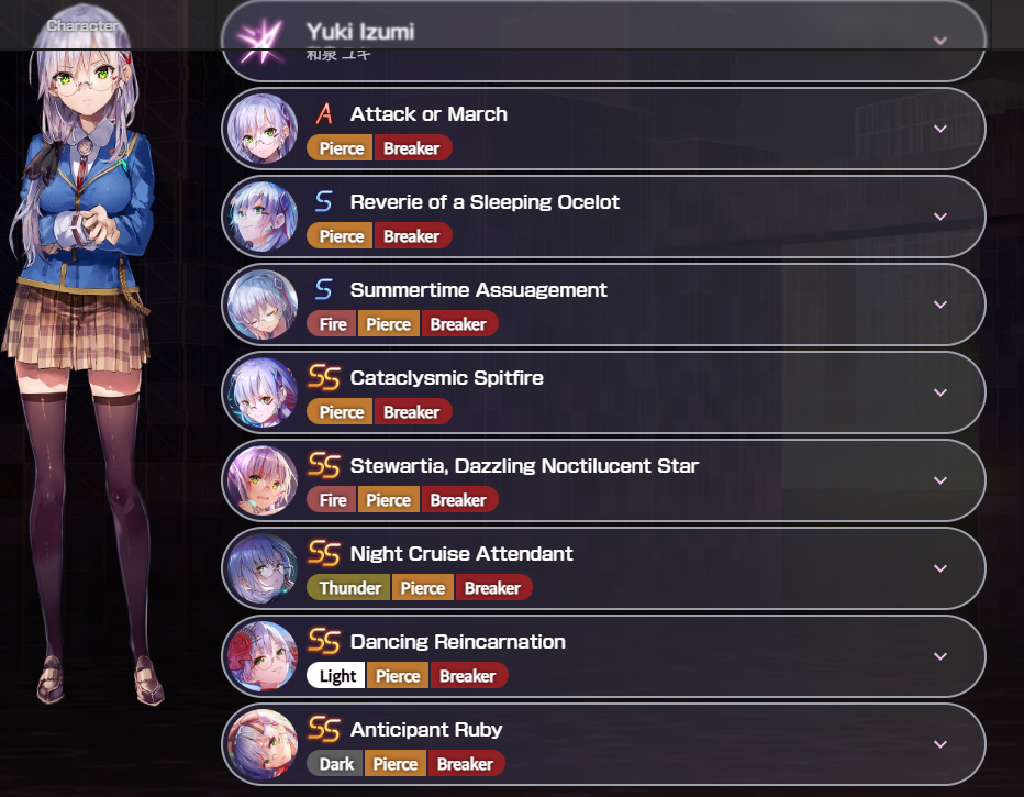 Я считаю, что сейчас нужно обязательно выкрутить унисон Руку - весьма смелый образ с пикантной деталью в виде zettai ryouiki. После наилучшим решением будет накопить 45000 кварца на абсолютно сногсшибательную диву Руку в роскошном, практически свадебном платье! Также было бы преступлением не отметить дерзкие и стильные сценические образы Руки, не заполучить которые было бы очень обидно, хоть я, скрепя сердце, и признаю, что тратить на них ценный ресурс в виде что времени, что кварца, пожалуй, не самое лучшее решение. Следует, однако, подчеркнуть, что всё вышеописанное - сугубо моё личное мнение, видящееся мне, насколько возможно, беспристрастным.