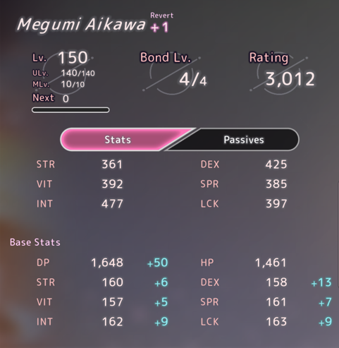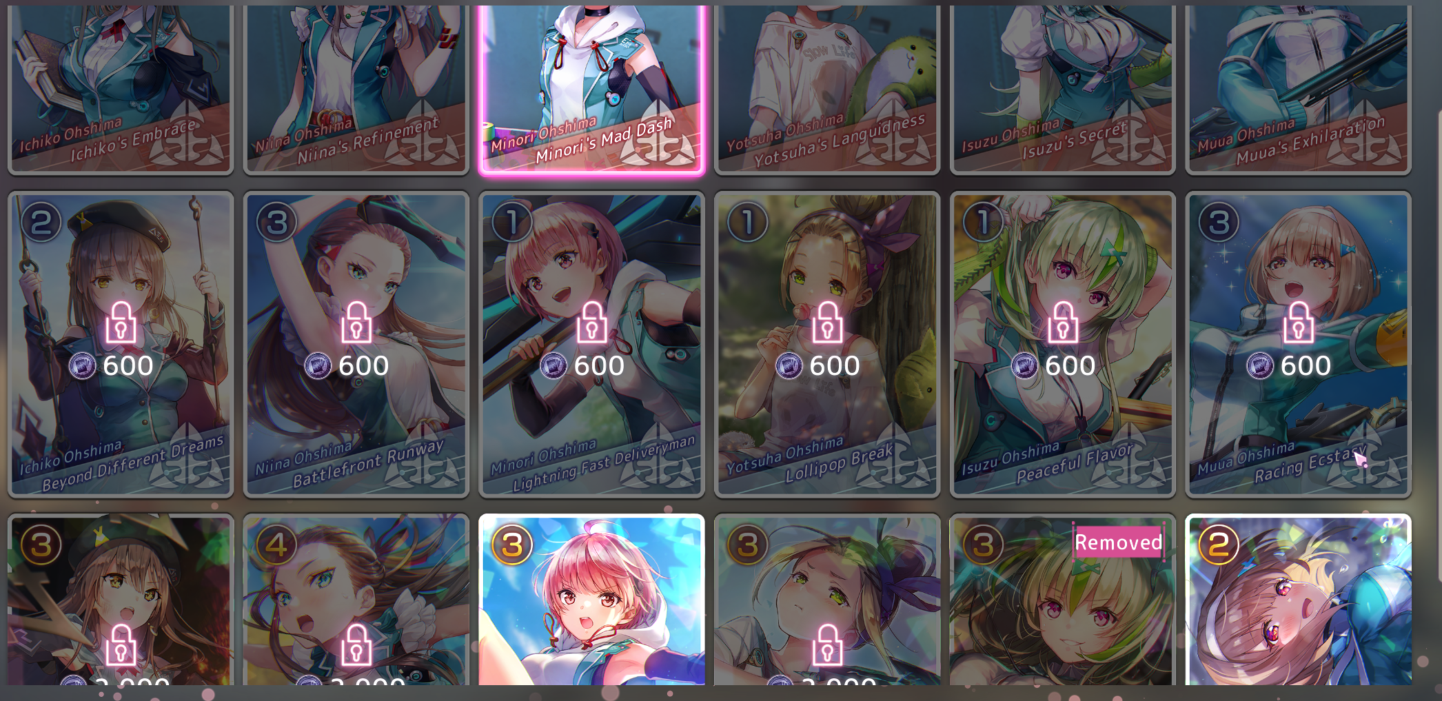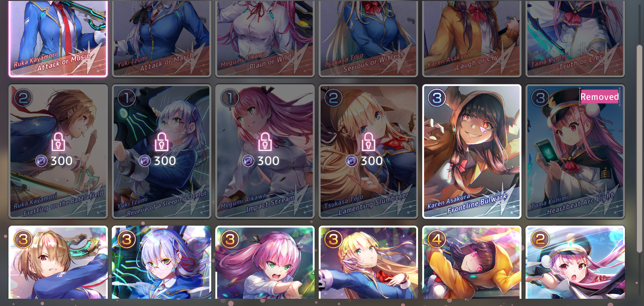 У меня наоборот после внезапной большой удачи на унисоне Руки этот вышел привычным спарком. По пути к 150 получил Мегумико лб2,5, Карен1 лб1 и Аой1 лб2,5. Из билета за бонусную шкалу вышла Юина2 лб1. Глядя на вырез платья унисона считаю такой итог приемлемым.