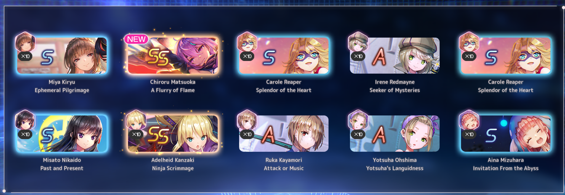 Я на дропы с зеленой гачи вообще не рассчитывал, изначально считал только четыре спарка с билетиков, а дропы взяли и пришли. Я залутал: Сейру; Фубуки; 2хМию; Юйну; Цукасу; Руку; Маки. Словом - неожиданный жир. К спаркам пока не притрагивался, сейчас буду думать, как ими грамотней распорядиться.