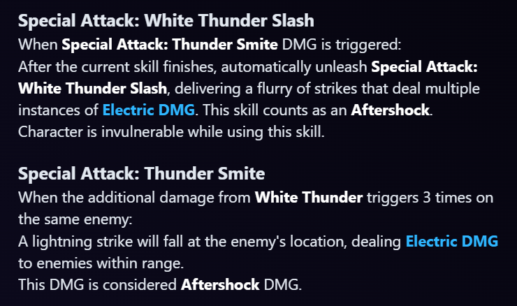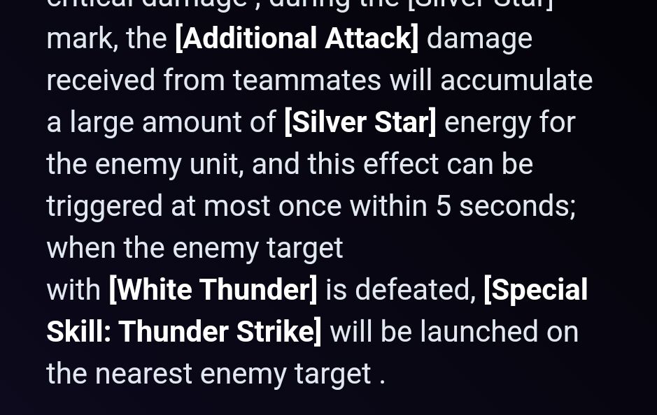 - When an enemy is Marked, Aftershock DMG from allies increases the Mark value on the enemy. can trigger once every 5s - When an enemy with an activated Mark dies, the White Thunder DMG instances will be automatically fired at the nearest enemy.