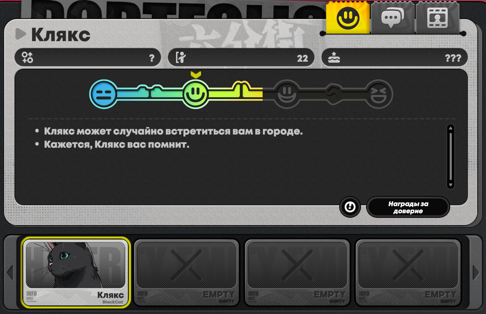 С появлением значков на плашках локаций, кто где пасётся, начал активничать с событиями на улучшение отношений с агентами и... какая же это фигня. Буквально с десяток раз приходится одни и те же диалоги прокликивать. Тут Ляо надо было или набор очков ускорять или разнообразие событий увеличивать, тем более там ни анимации, ни озвучки, можно было нагенерировать не повторяющегося нейрокала.