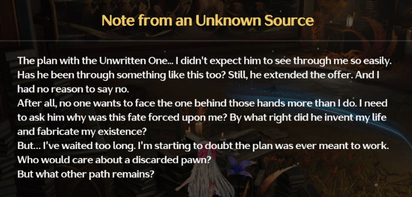 Мысли? Чья записка? Записка из неизвестного источника План с Ненаписанным... Не думала, что он так легко увидит меня насквозь. Неужели он тоже через подобное прошёл? И всё же он сделал мне предложение. А у меня не было причин отказываться. В конце концов, никто не жаждет встречи с тем, кто стоит за этими руками, сильнее меня. Я должна спросить его, почему мне навязали эту судьбу? По какому праву он выдумал мою жизнь и сотворил моё существование? Но... я ждала слишком долго. Я начинаю сомневаться, что этот план вообще мог сработать. Кому есть дело до выброшенной пешки? Но какой ещё путь мне остаётся?