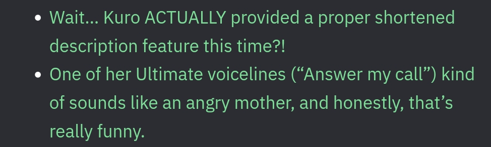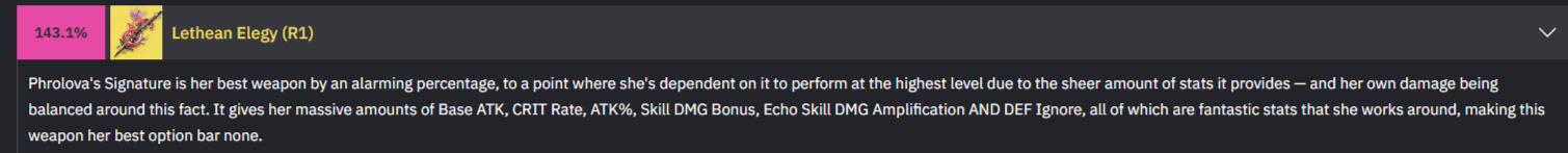 Выходит персонаж, который гибко встает в любую команду, может быть как мДД, так и гибридом, но урон персонажа довольно сильно баффает сигнатурка: >Her weapon situation is worse than Brant’s. Treat Phrolova as a package deal: pull her with her Signature, else we simply recommend to pull Camellya instead for a Havoc DPS (unless you really like Phrolova, we understand)