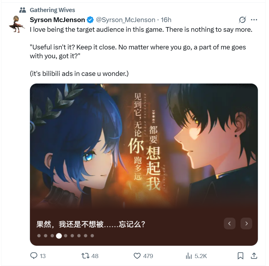 >>5577695 >>5577725 Посмотрел весь это диалог, просто ультраюшковый. Пока не смотрел англ, но она в китайском сперва прямым текстом обыгрывает идиому про луну в воде (недостижимость, тщетность каких-либо усилий), вот только она указывает, что (Ю) сделал невозможное возможным: поймал "луну" (её). Особенно момент: Юнона: «А теперь... посмотри на луну вместе со мной. Я поделюсь с тобой здешним лунным светом. Считай это... ответным подарком за то, что вернул меня сюда». Ровер: «А я думал, браслет был ответным подарком». Юнона: «Я же говорила, что я очень щедрая. Особенно по отношению к тебе... Одного ответного подарка будет слишком мало». ну и затем эта фраза про луну. Там не может никаких «но», китайская фраза: 今夜这里的月色很美 — прямой аналог японской 月が綺麗ですね, это та самая классическая фраза-признание в любви.