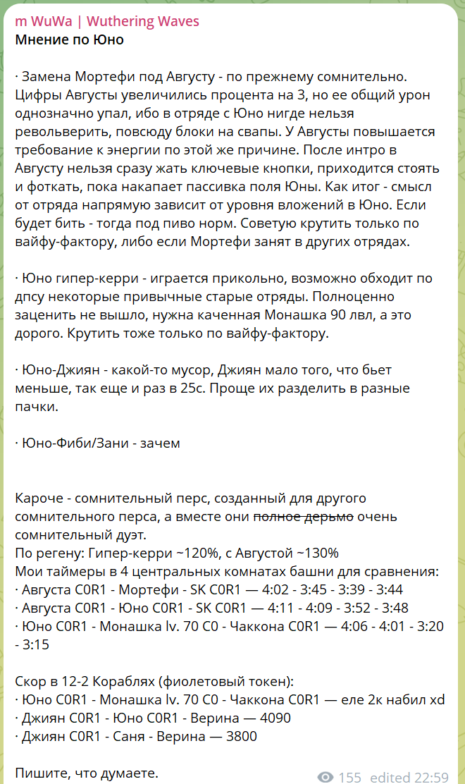 Не знаю как так, но моя Юнона с2р1 в соло дамажит больше с3р1 Катяха в топовой пачке. В башню не лез пока, смотрел на боссах (в том числе с аэро резистами), в целом впечатления очень положительные, очень жалею об инвестициях в катях. Сейчас бы с6 оформил, эх...